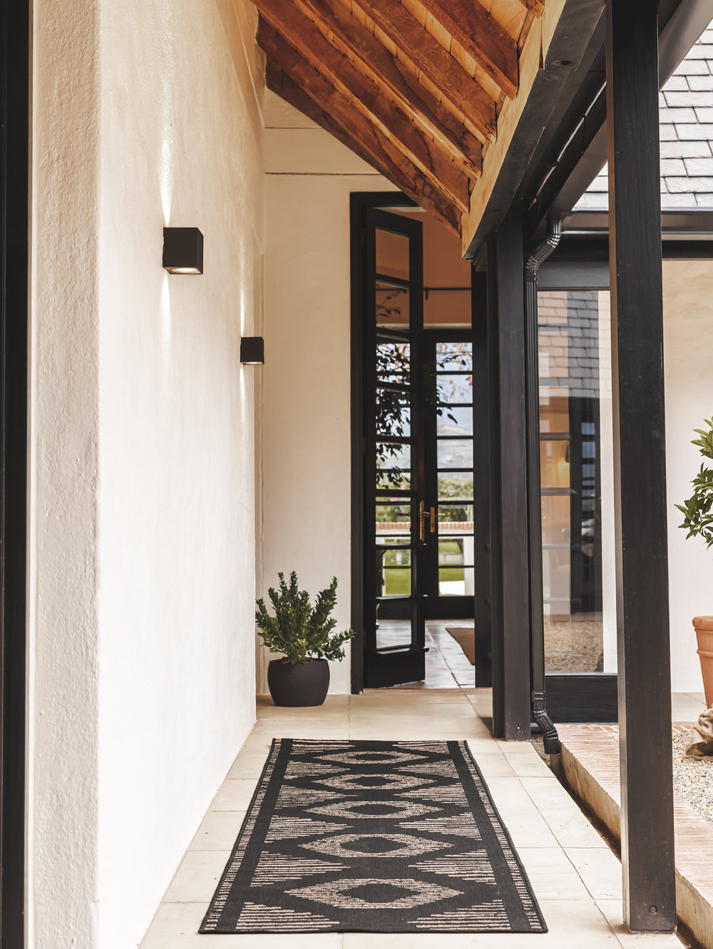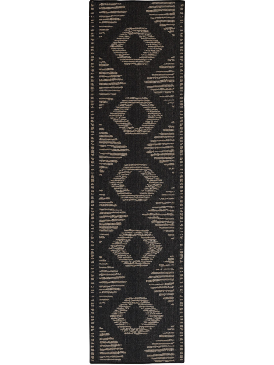 Fully outdoor polypropylene rugs and runners with desert-inspired designs.
