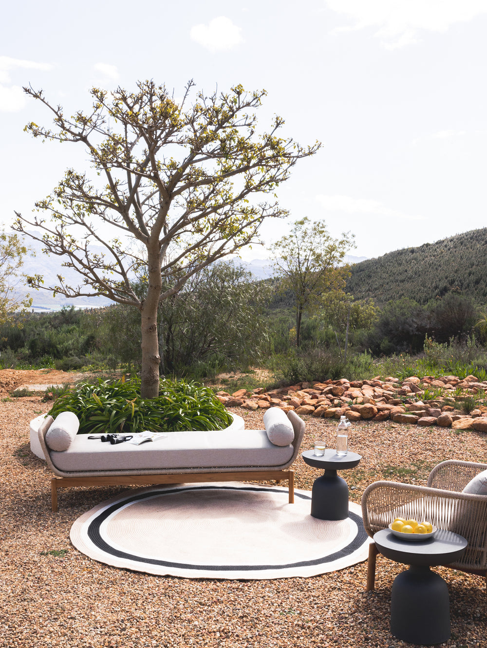Lay the foundations for easy-breezy style with Hilo rugs. These fully outdoor rugs are made of recycled PET polyester and provide hassle-free maintenance – simply hose them down with water and leave out in the sun. A natural tone forms the basis of these simple-to-style round rugs and a muted note of colour to complement your surroundings.