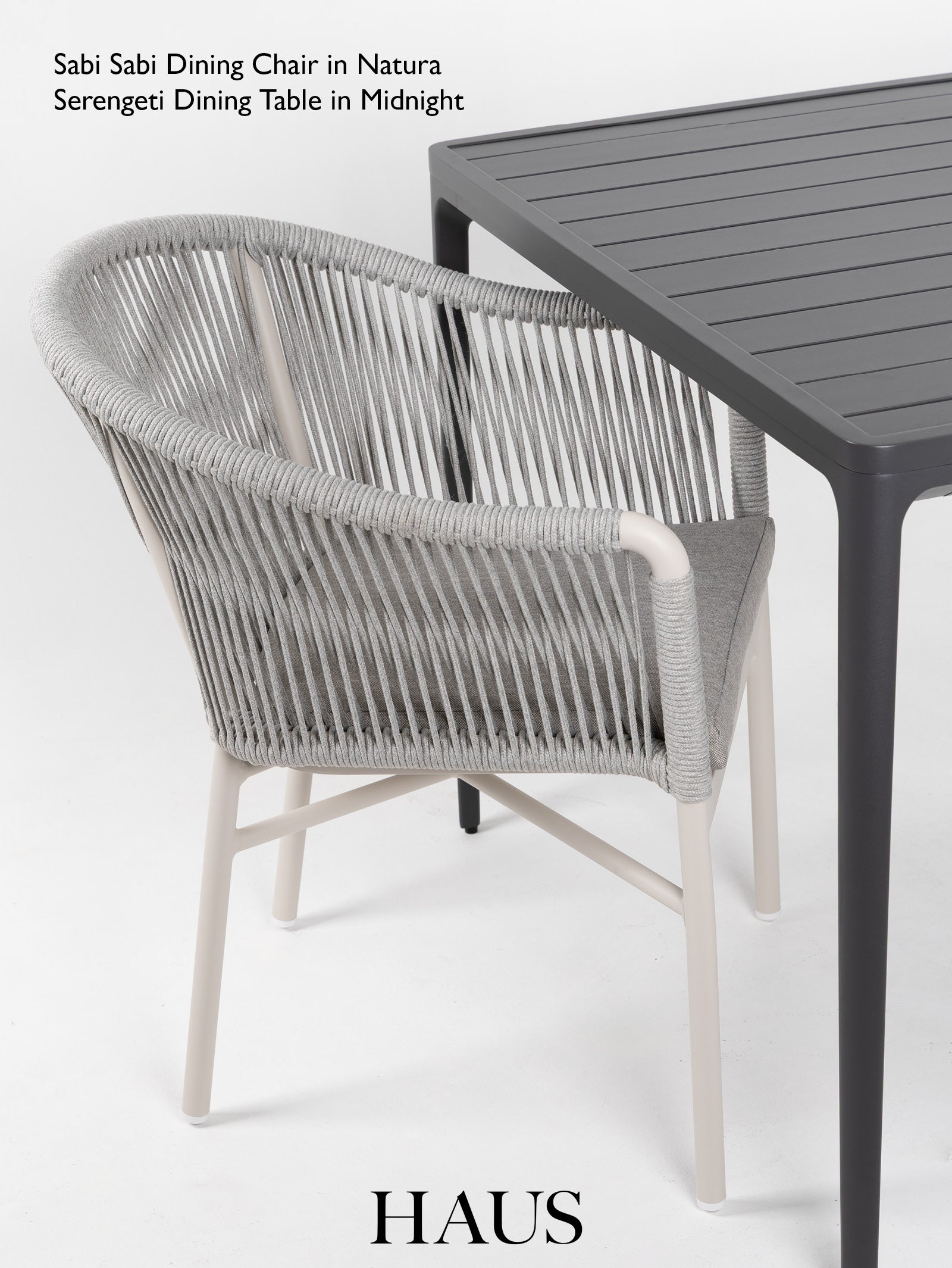 Comprising a dining chair, bench and occasional chair, the Sabi Sabi seating range will help you achieve resort-level relaxation in any outdoor area. Supported by a weather-ready aluminium frame and UV-resistant rope, and featuring easy-drain foam cushions wrapped in moisture-repelling olefin fabric, Sabi Sabi seating offers lasting comfort and durability, perfect for outdoor lounging in any climate. Available in two colourways.