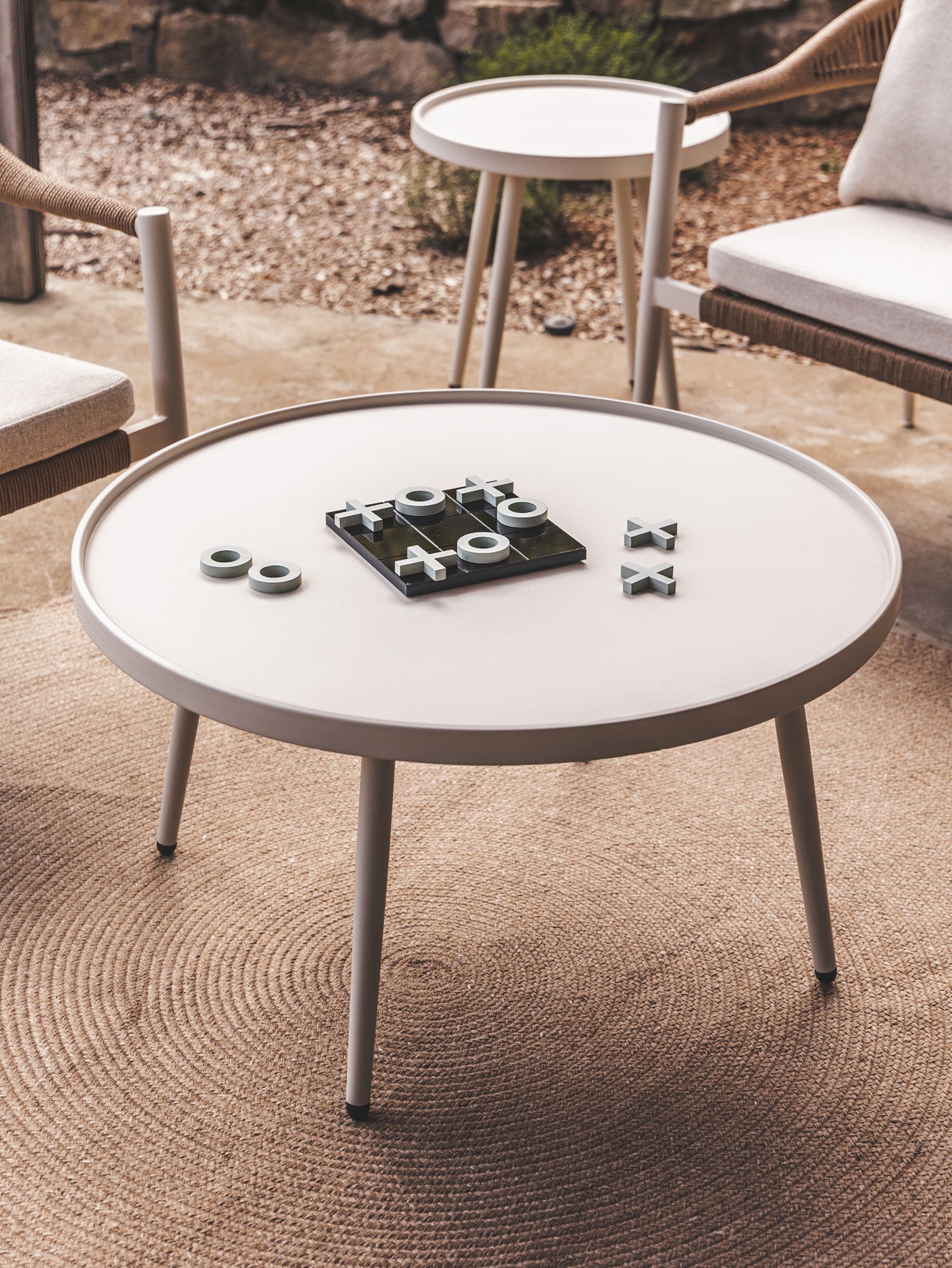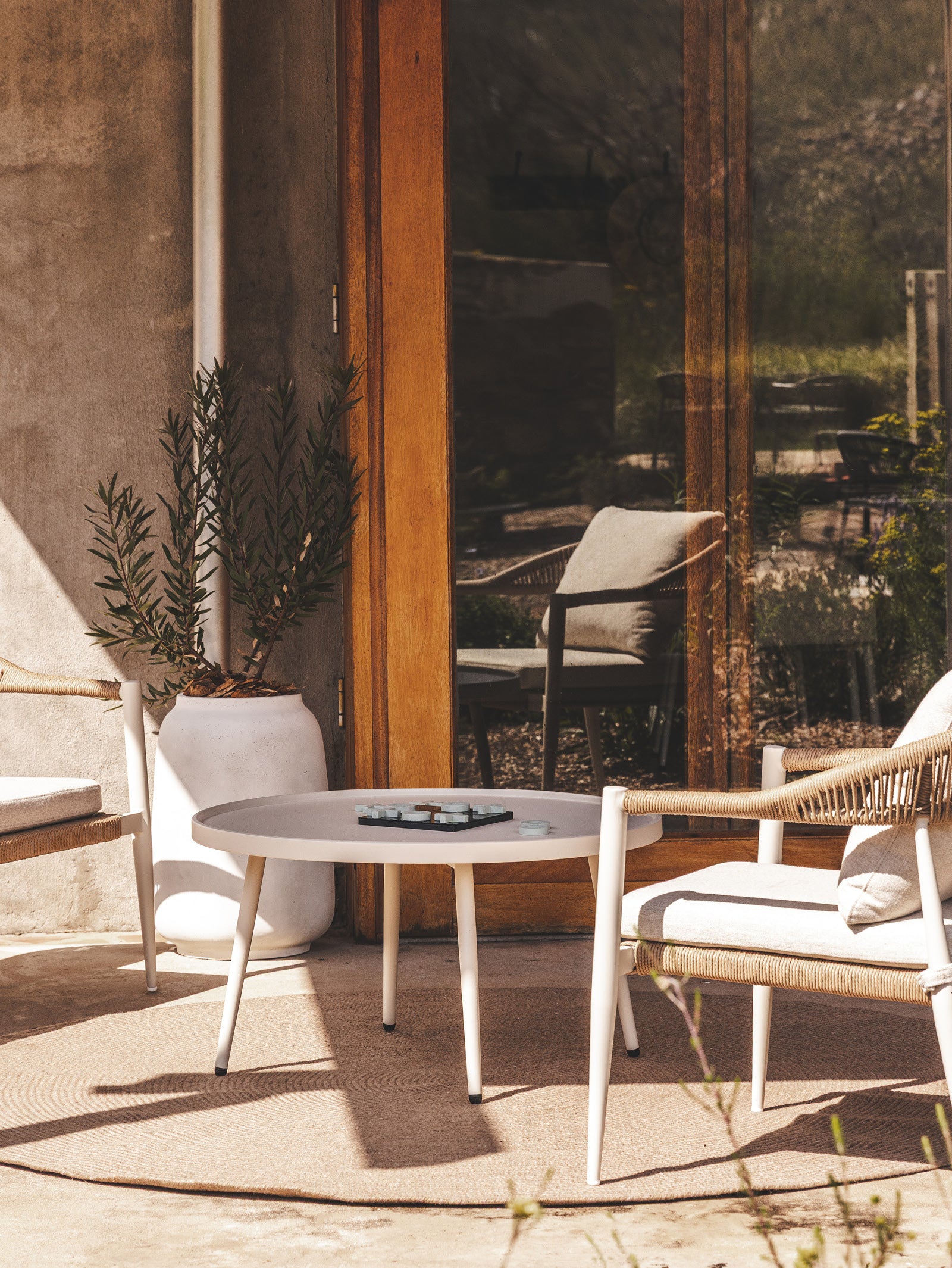 Round, fully outdoor rugs made of weather-ready PET polyester.