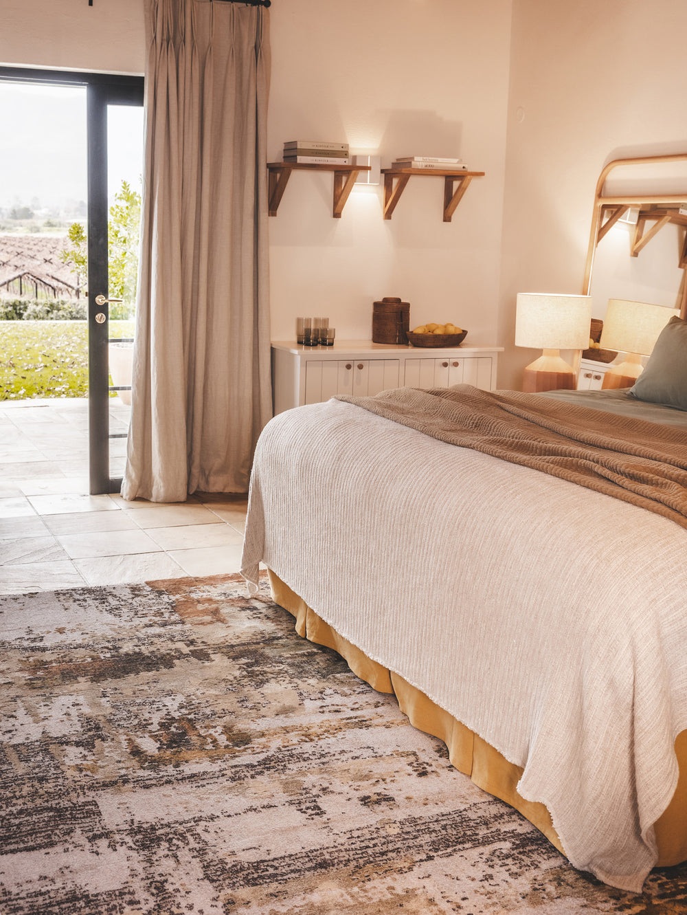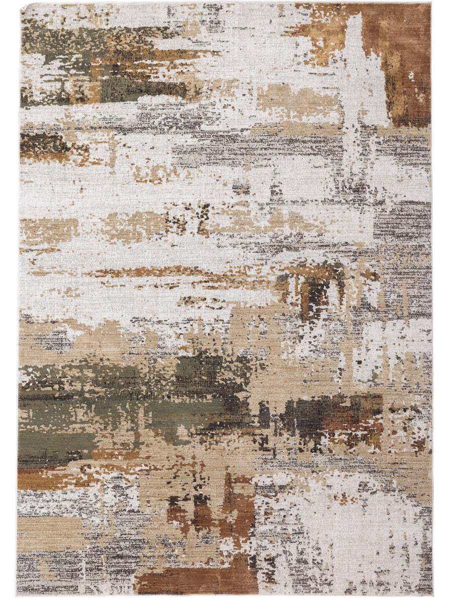 Durable polyester rugs with painterly patterning and earthy tones for artful, high-traffic style.