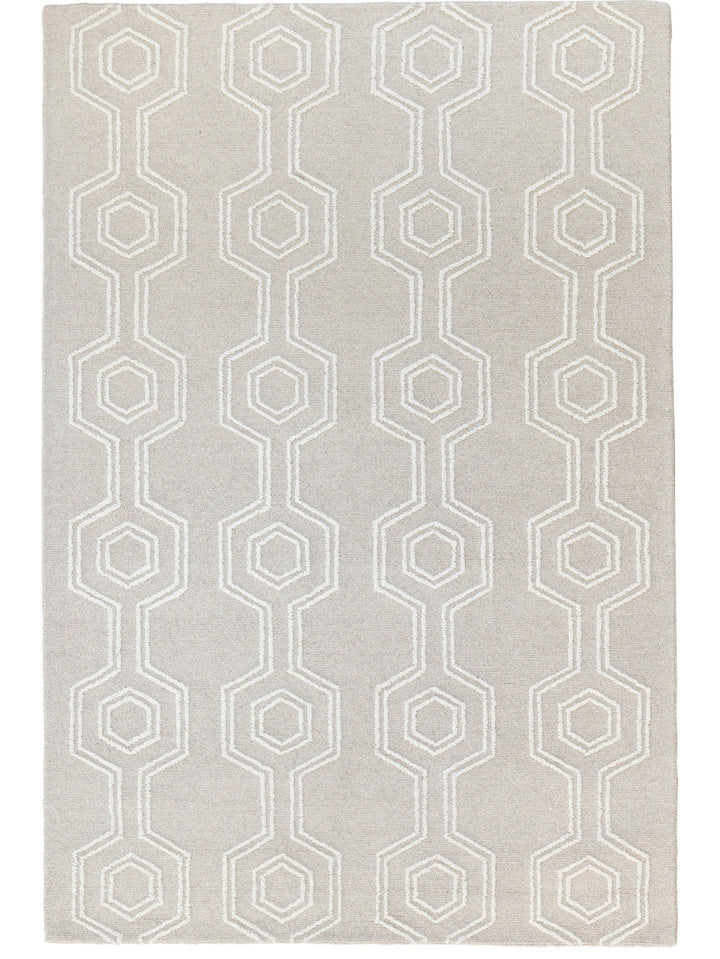Handwoven wool rug featuring a loop pile with a hexagon pattern and a durable cotton backing, offering a refined, texture finish.