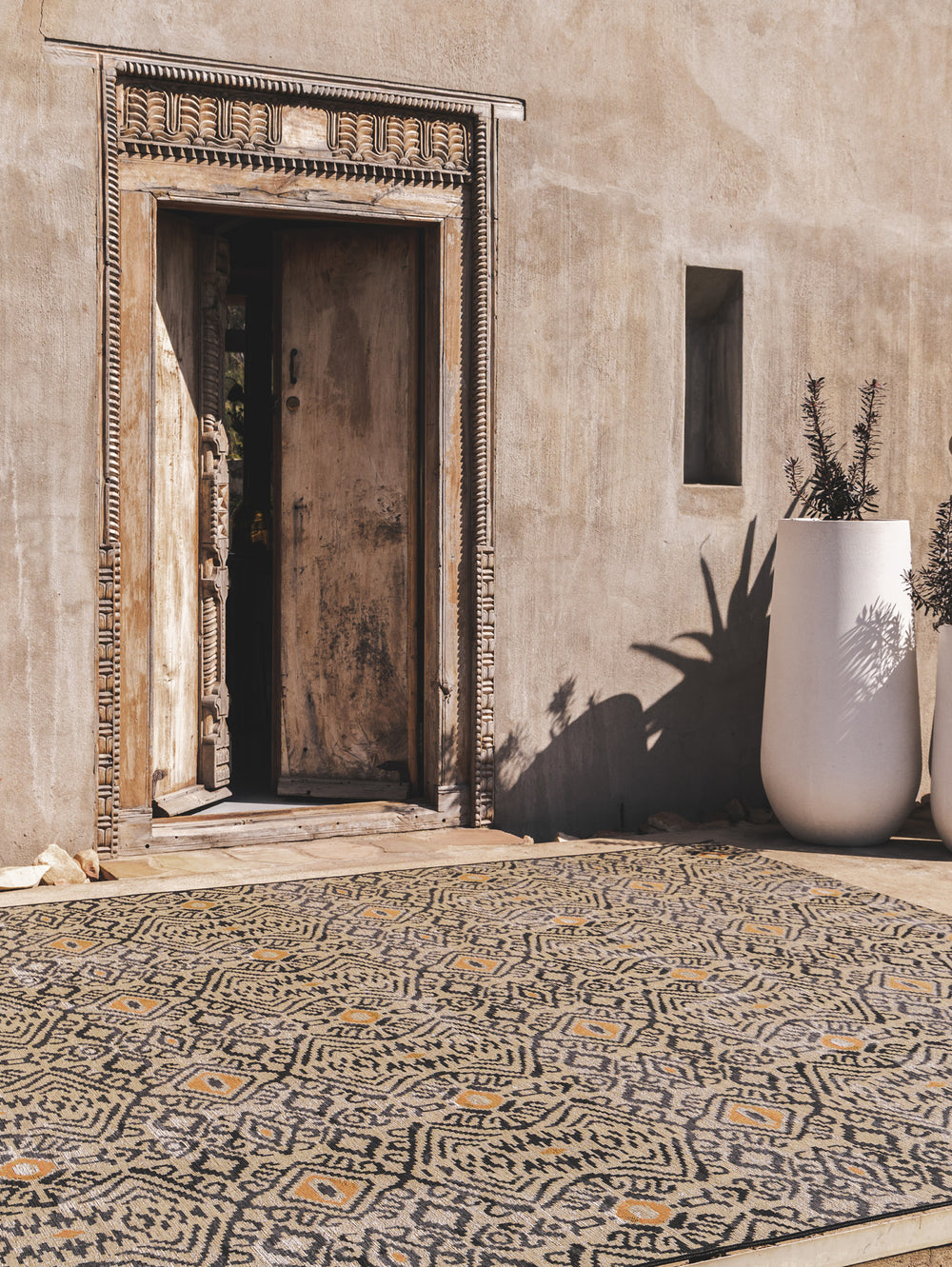 Fully outdoor rugs with Africa-inspired patterns and earthy tones.