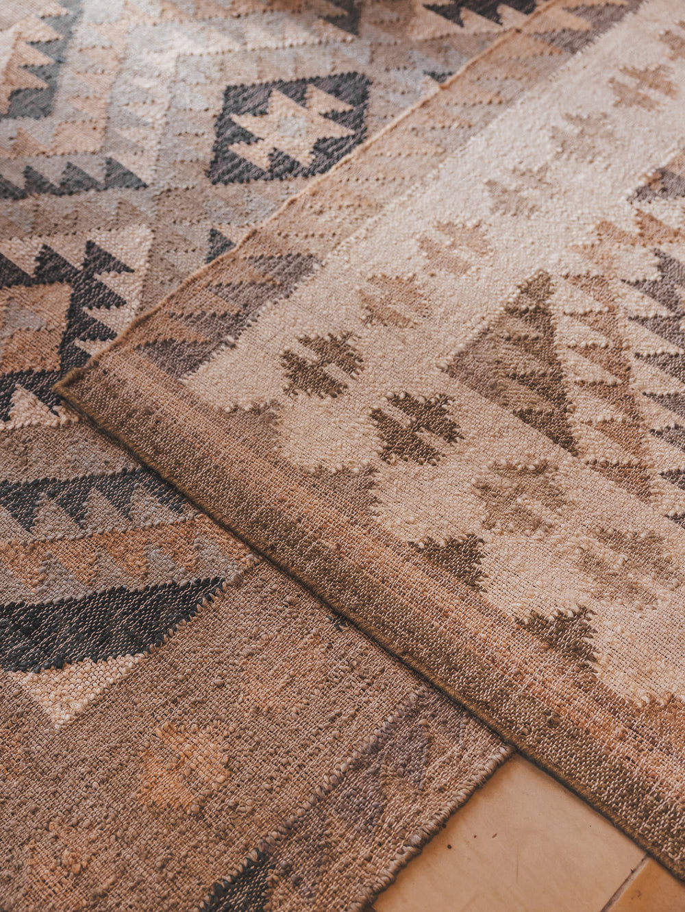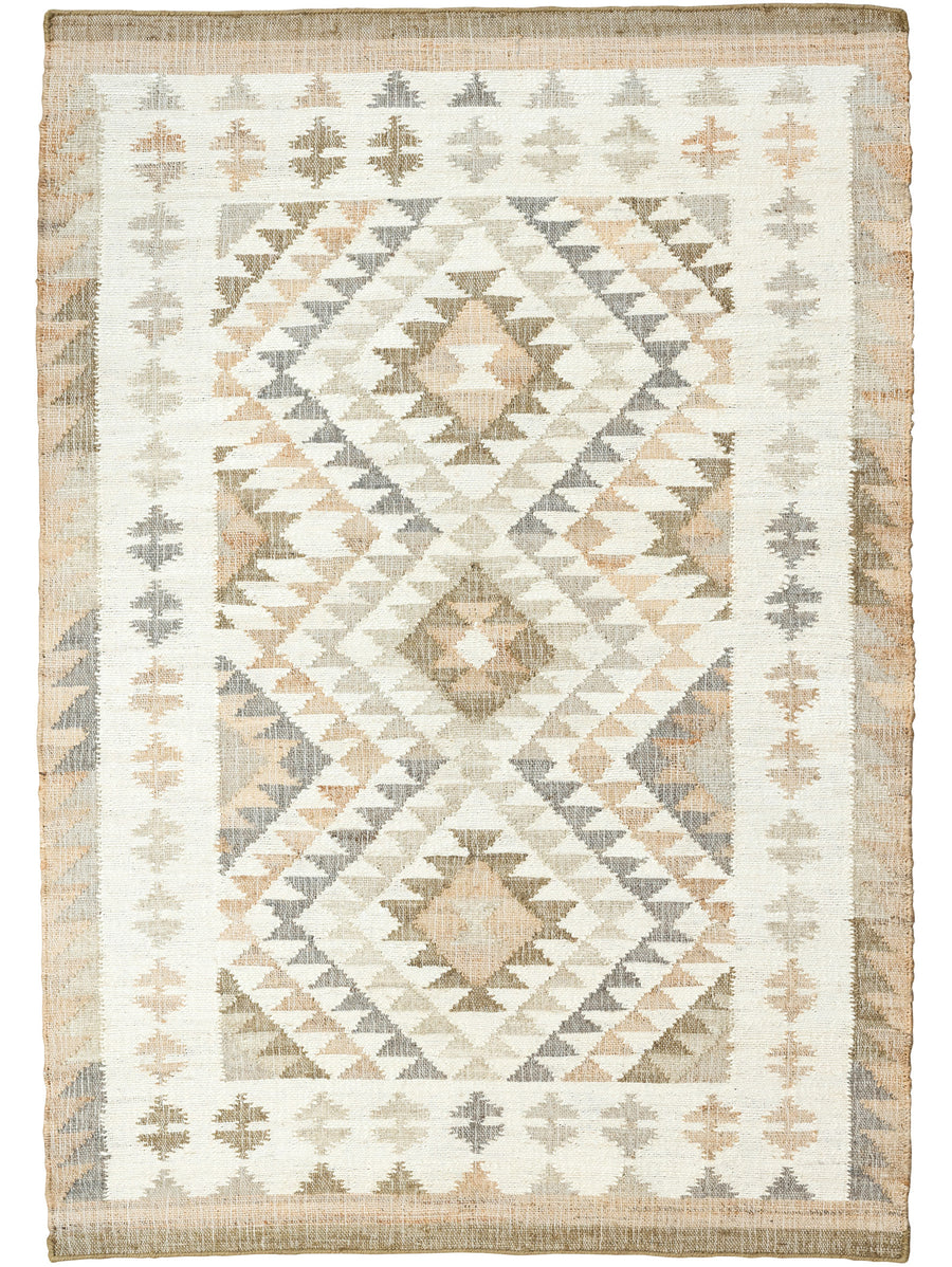 Handwoven Aztec-style jute-cotton rug in one large size.
