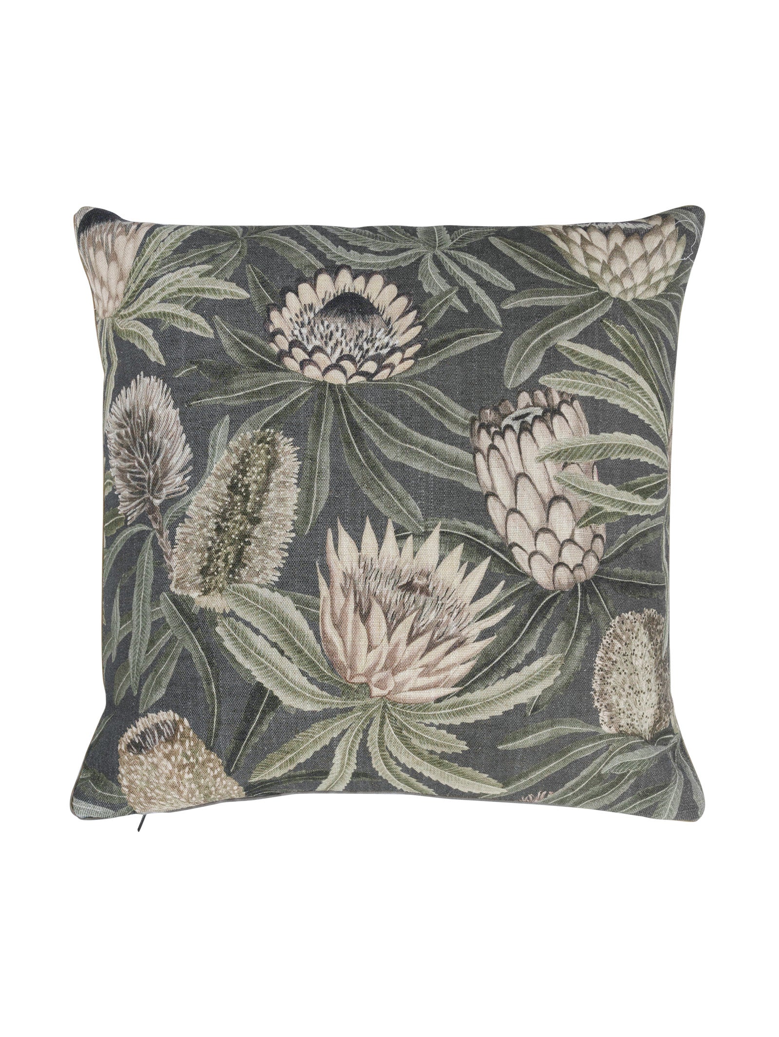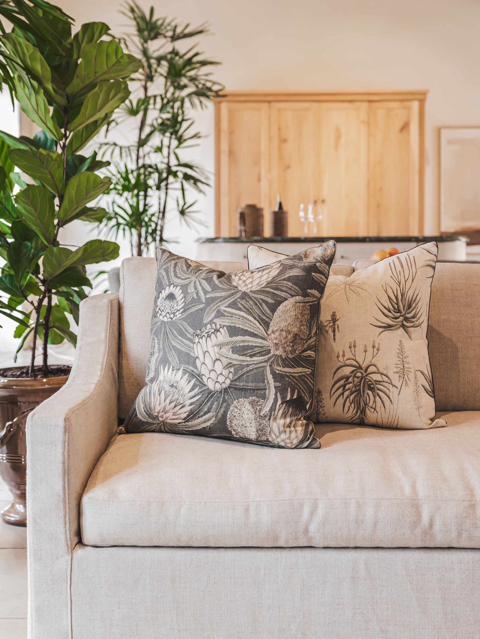 Inspired by the natural beauty of the veld, the Royal Botanical scatter collection offers a fresh take on classic botanical art. It features dramatic indigenous blooms like proteas and aloes, rendered in soft, dusty tones that evoke a warm, earthy mood. Each piece is printed on a rich fabric blend that enhances the design's appeal and is finished with modern details like an exposed YKK metal zip and piping. Duck feather-duck down inner included.