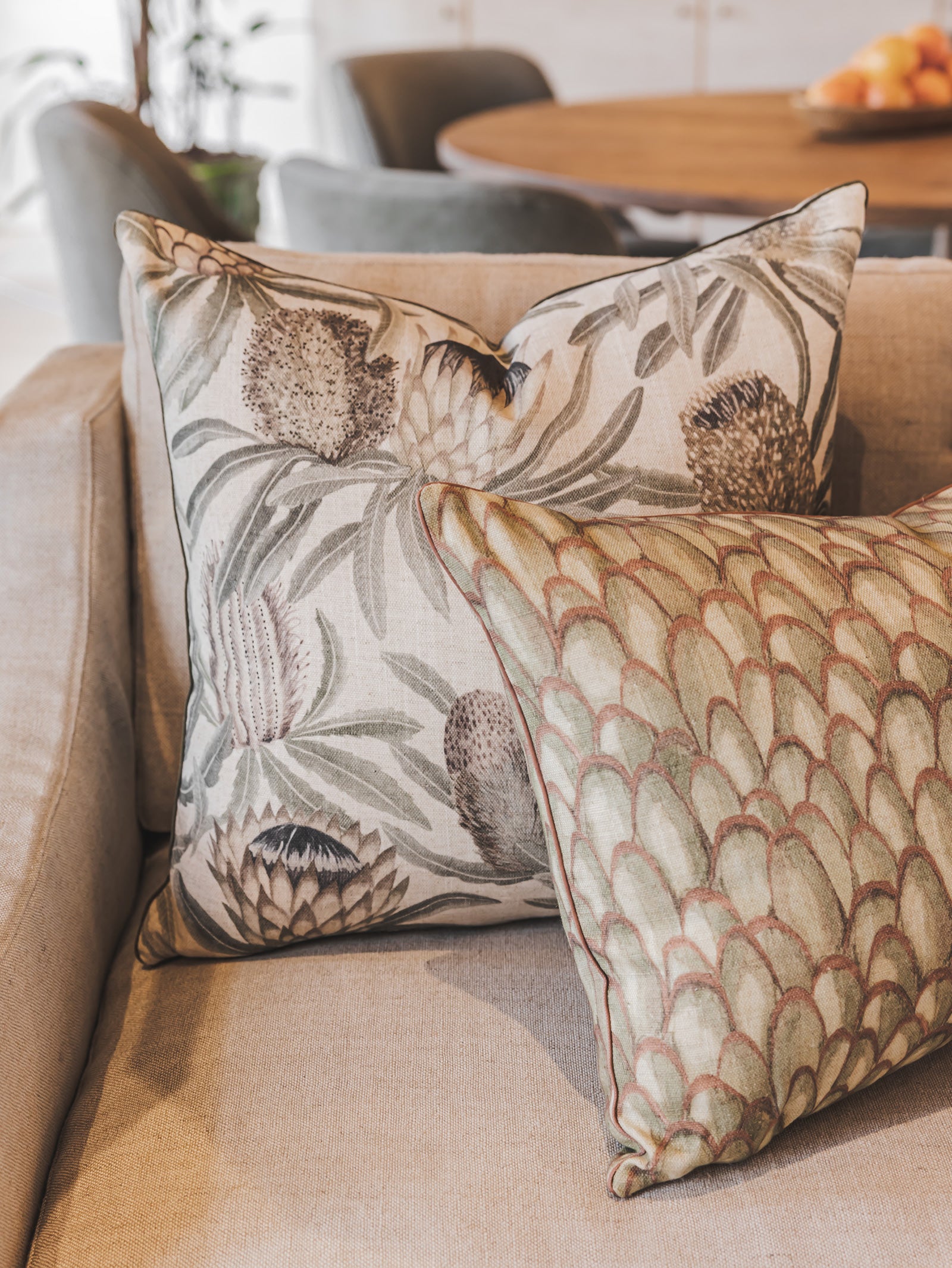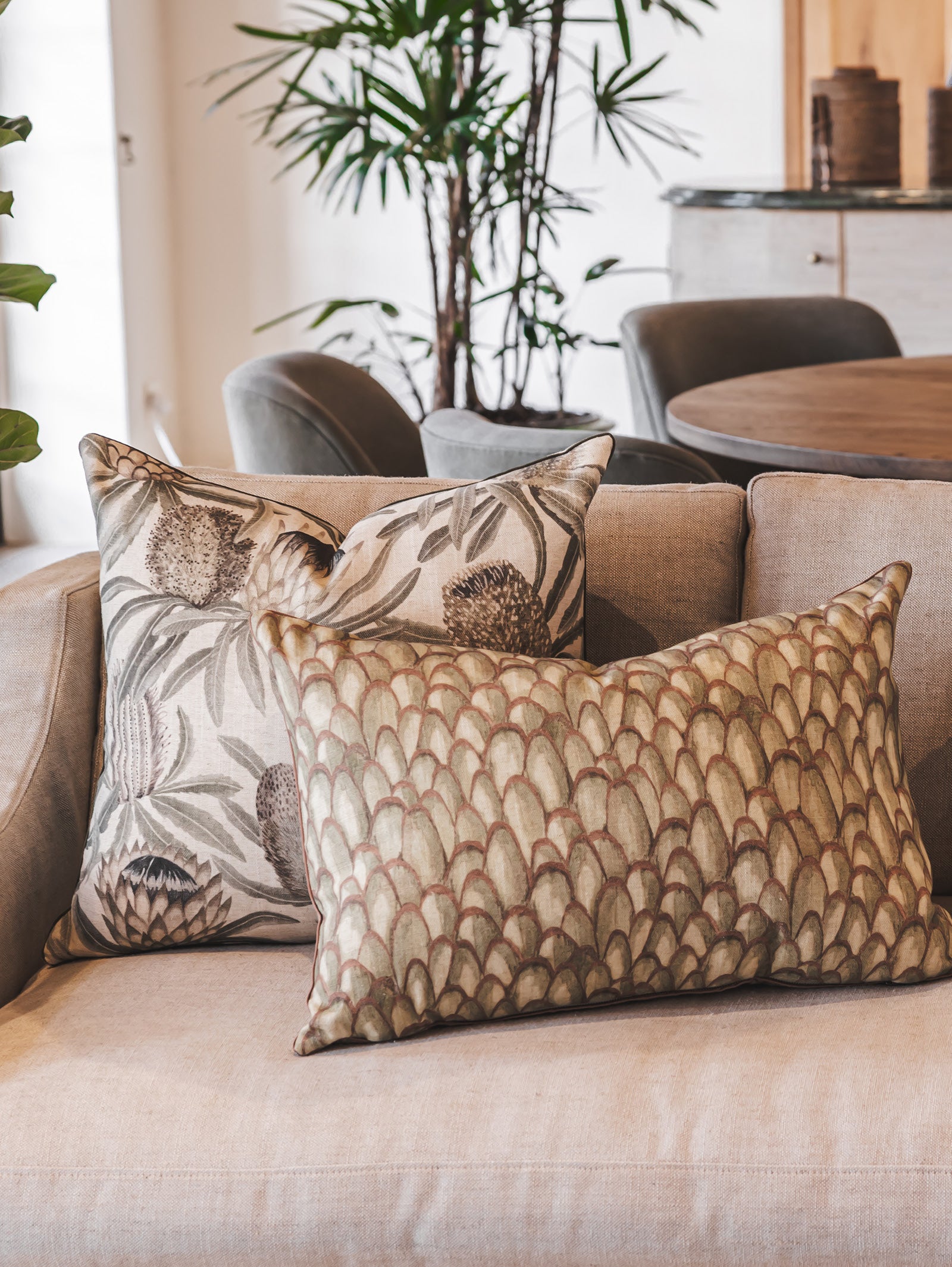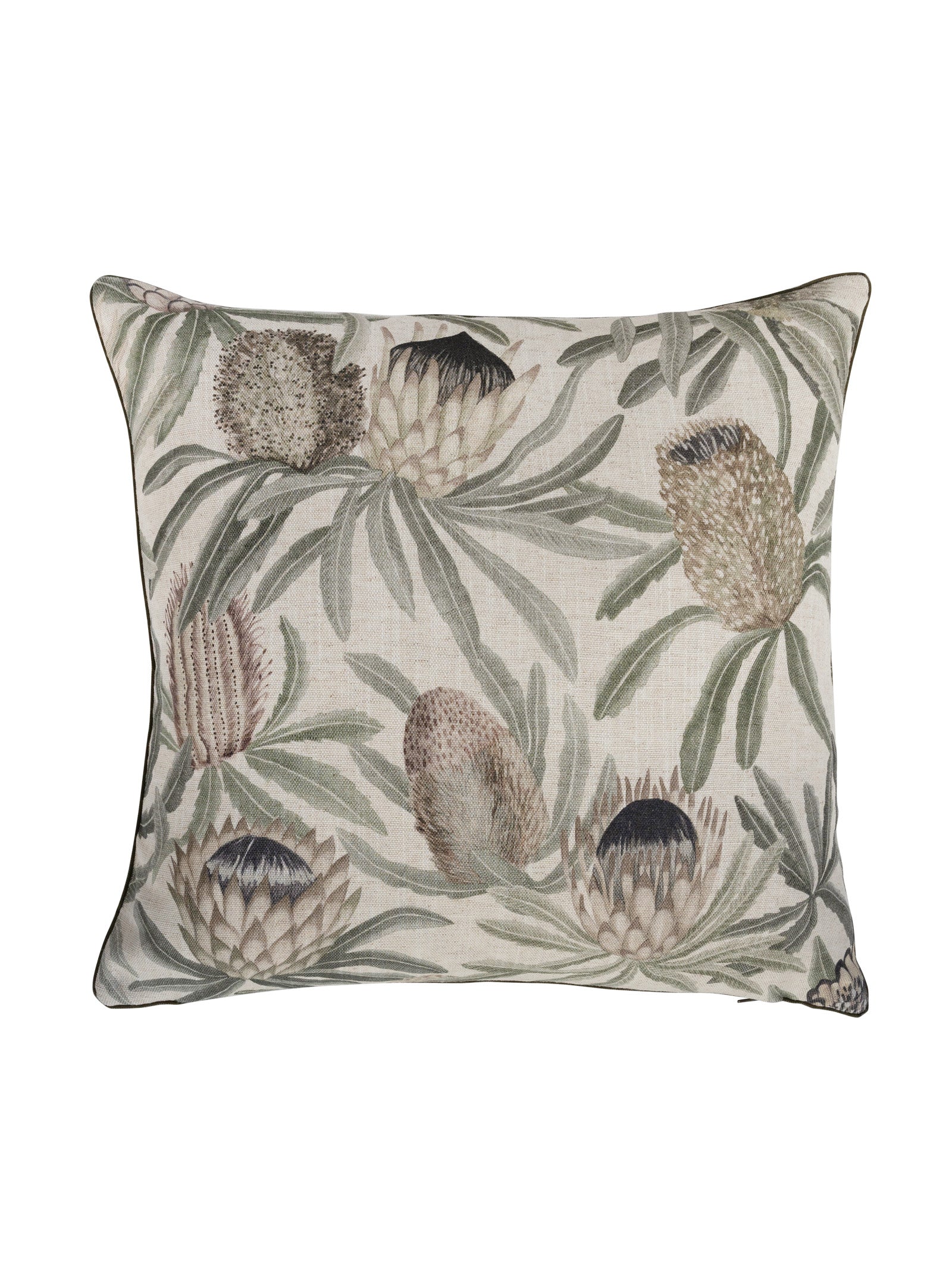 Inspired by the natural beauty of the veld, the Royal Botanical scatter collection offers a fresh take on classic botanical art. It features dramatic indigenous blooms like proteas and aloes, rendered in soft, dusty tones that evoke a warm, earthy mood. Each piece is printed on a rich fabric blend that enhances the design's appeal and is finished with modern details like an exposed YKK metal zip and piping. Duck feather-duck down inner included.