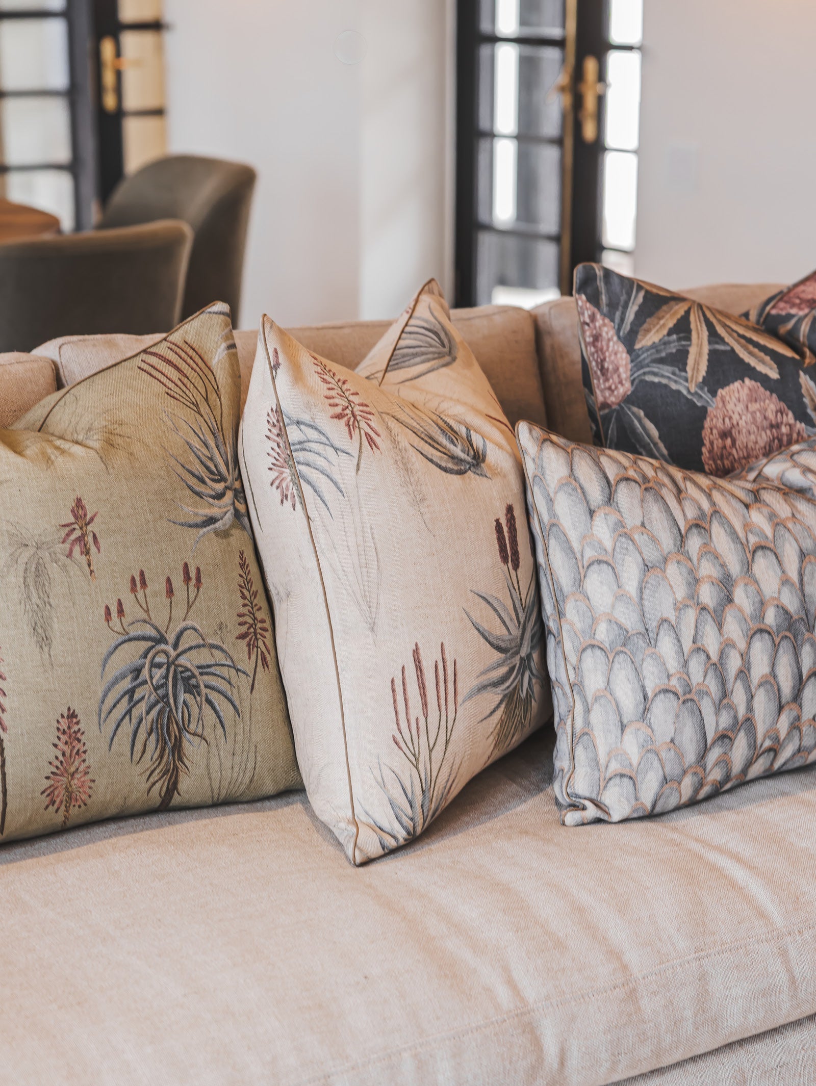 Inspired by the natural beauty of the veld, the Royal Botanical scatter collection offers a fresh take on classic botanical art. It features dramatic indigenous blooms like proteas and aloes, rendered in soft, dusty tones that evoke a warm, earthy mood. Each piece is printed on a rich fabric blend that enhances the design's appeal and is finished with modern details like an exposed YKK metal zip and piping. Duck feather-duck down inner included.