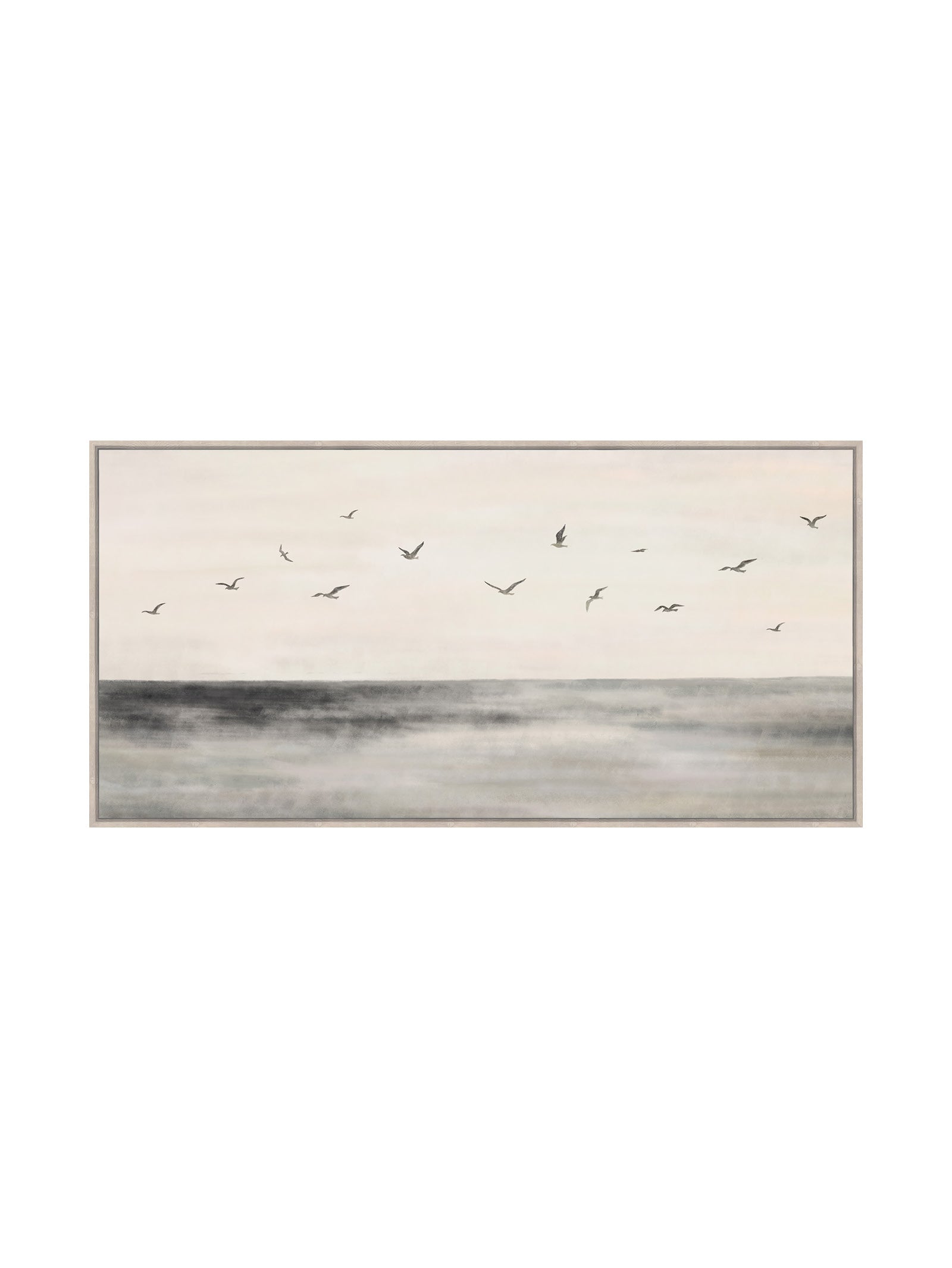 Capture the essence of coastal calm with the Seabreeze Glide Wall Art in Ocean. This large, framed canvas evokes the gentle movement of sea air and water through soft, abstract forms and a soothing ocean-inspired palette.