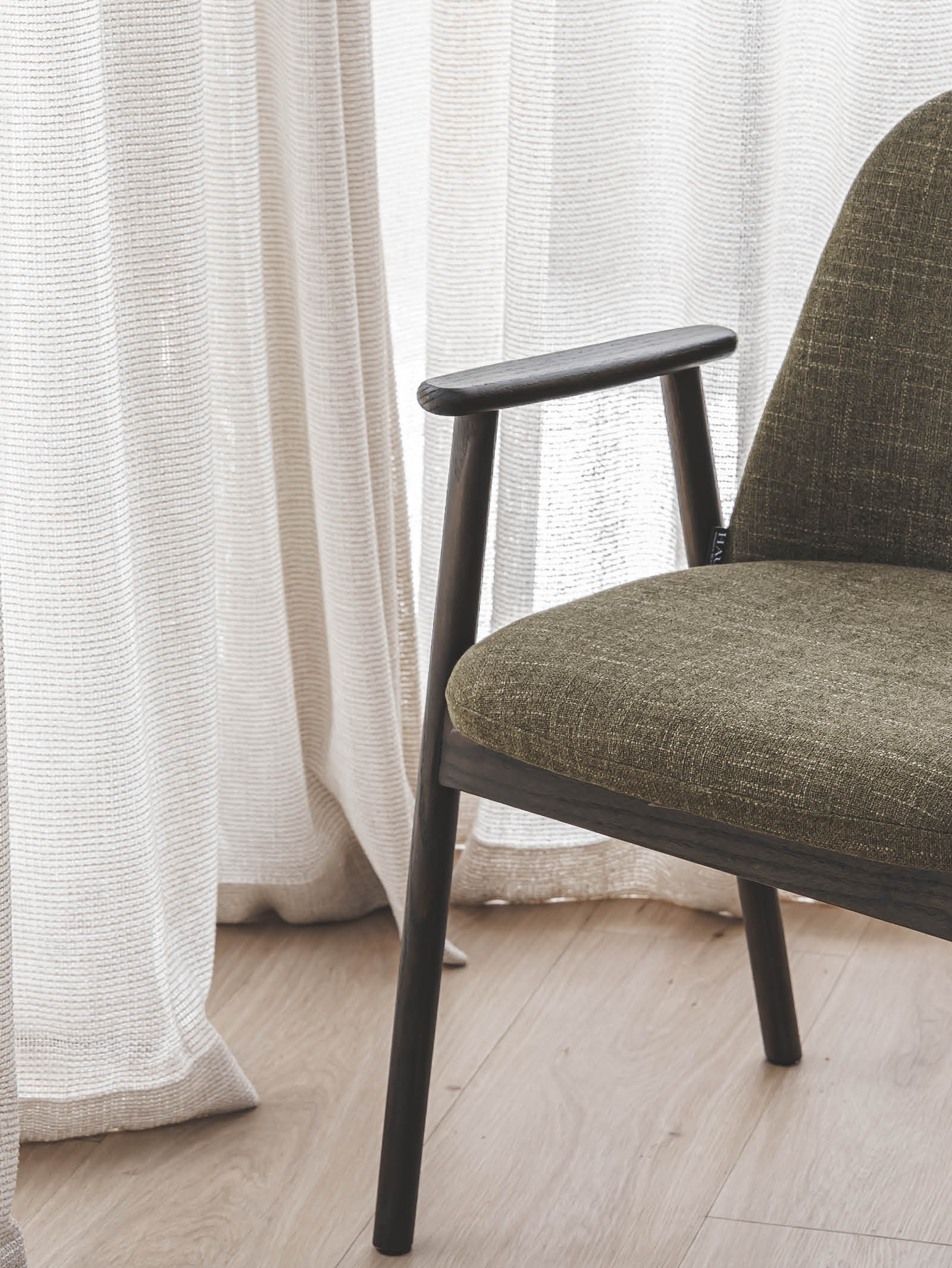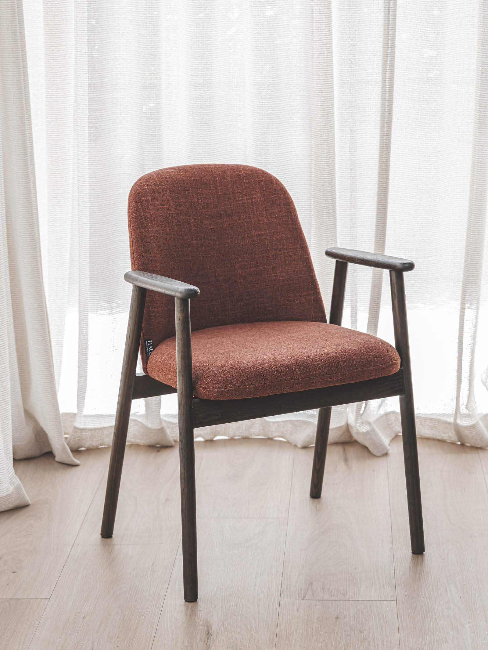 Solid, warm and graceful, the Albert oak dining chair will ground any dining area. Made of solid oak and featuring a dark grain, this chair celebrates the natural beauty of wood. Supportive armrests are a feature of its clean, contemporary silhouette and provide a welcome perch during leisurely meals. Hertex's Global fabric offers the final touch of sophistication.