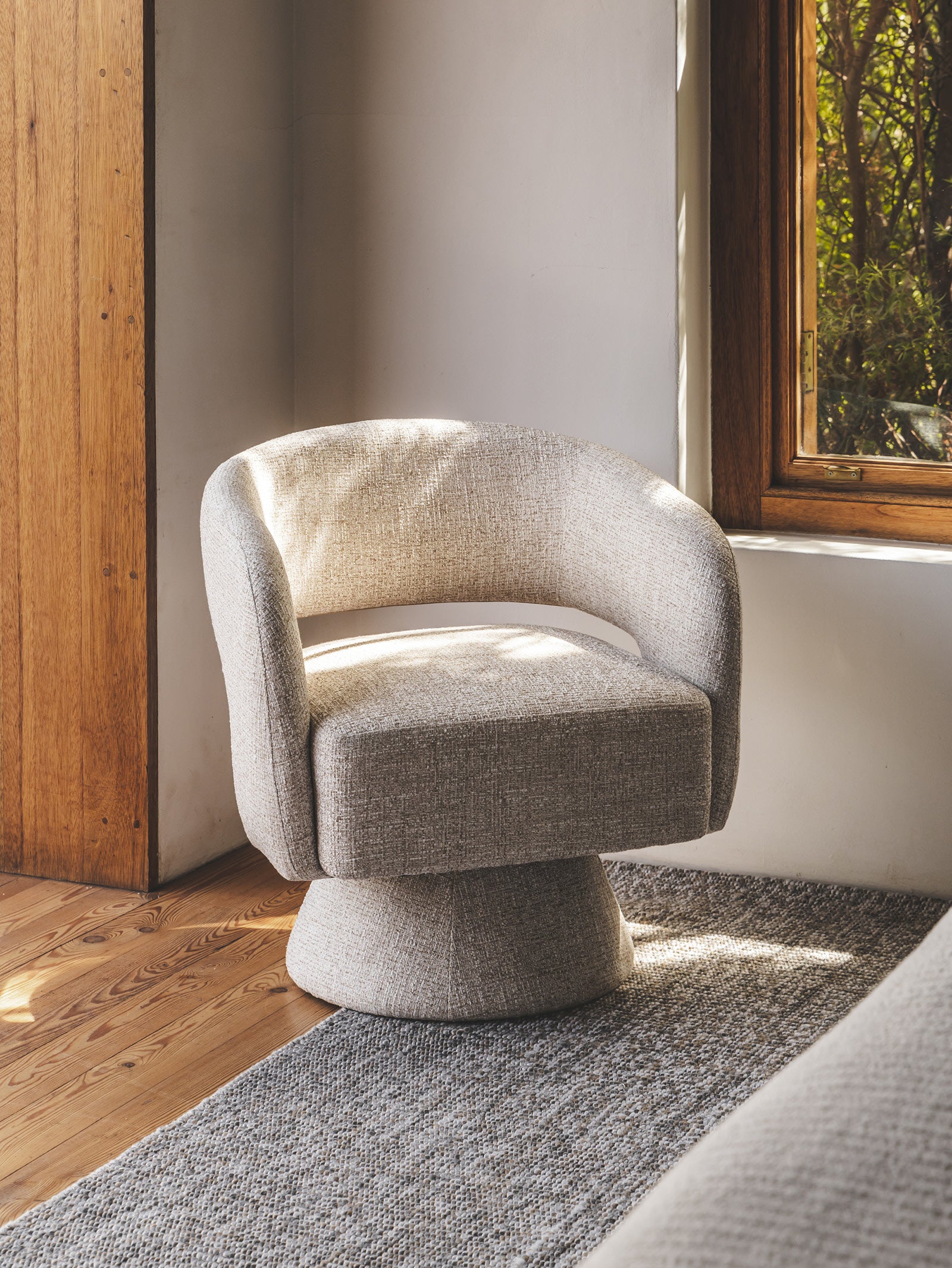 Swivel chair upholstered with Hertex's Cosmopolitan fabric.