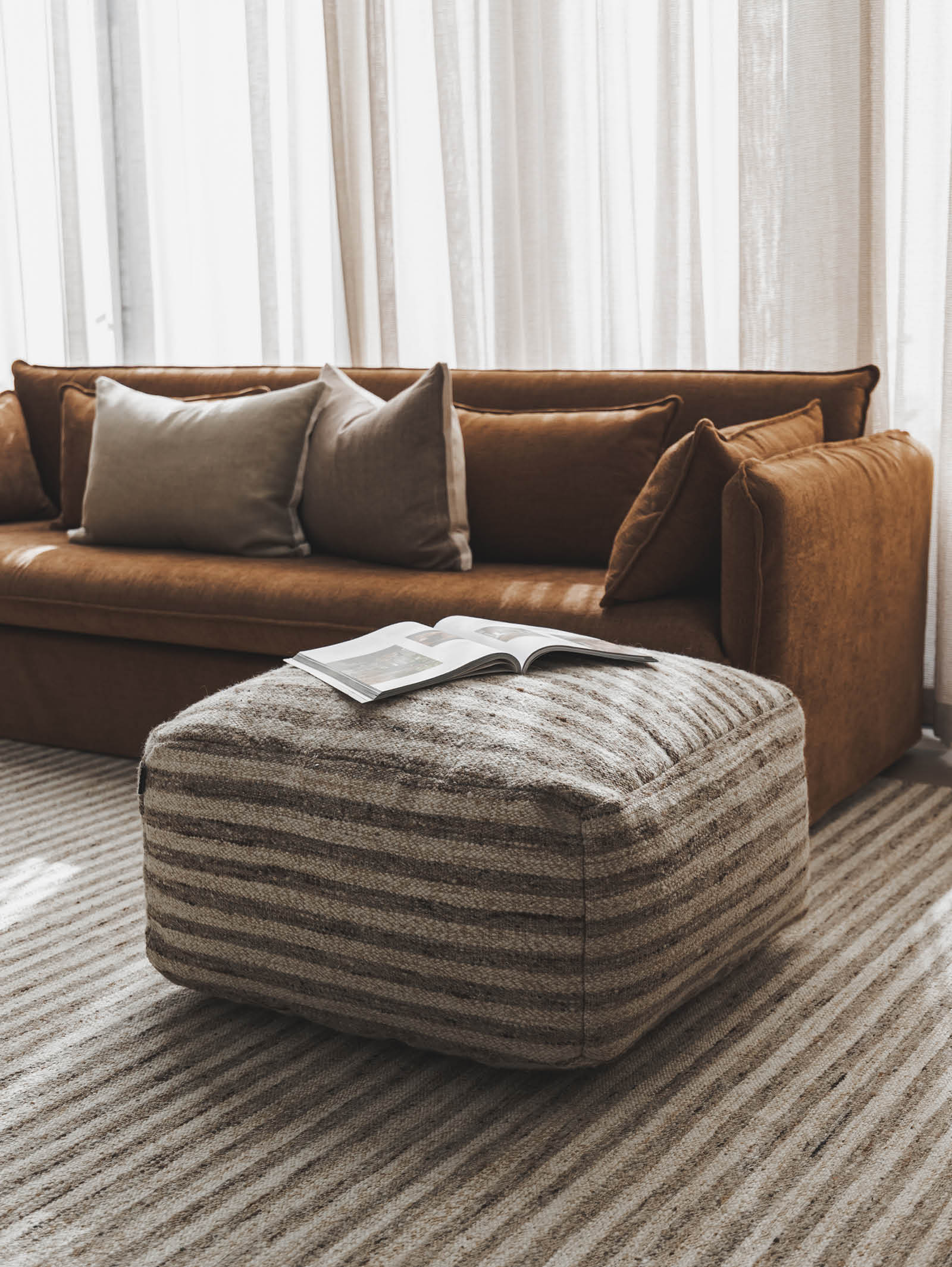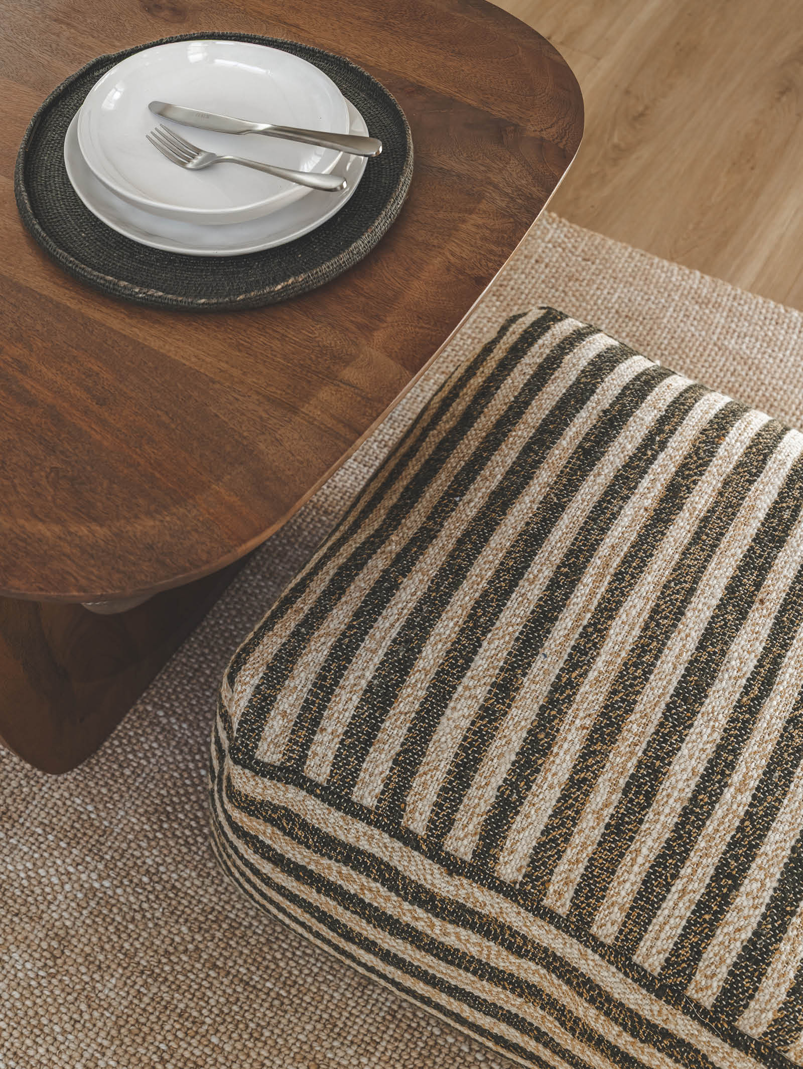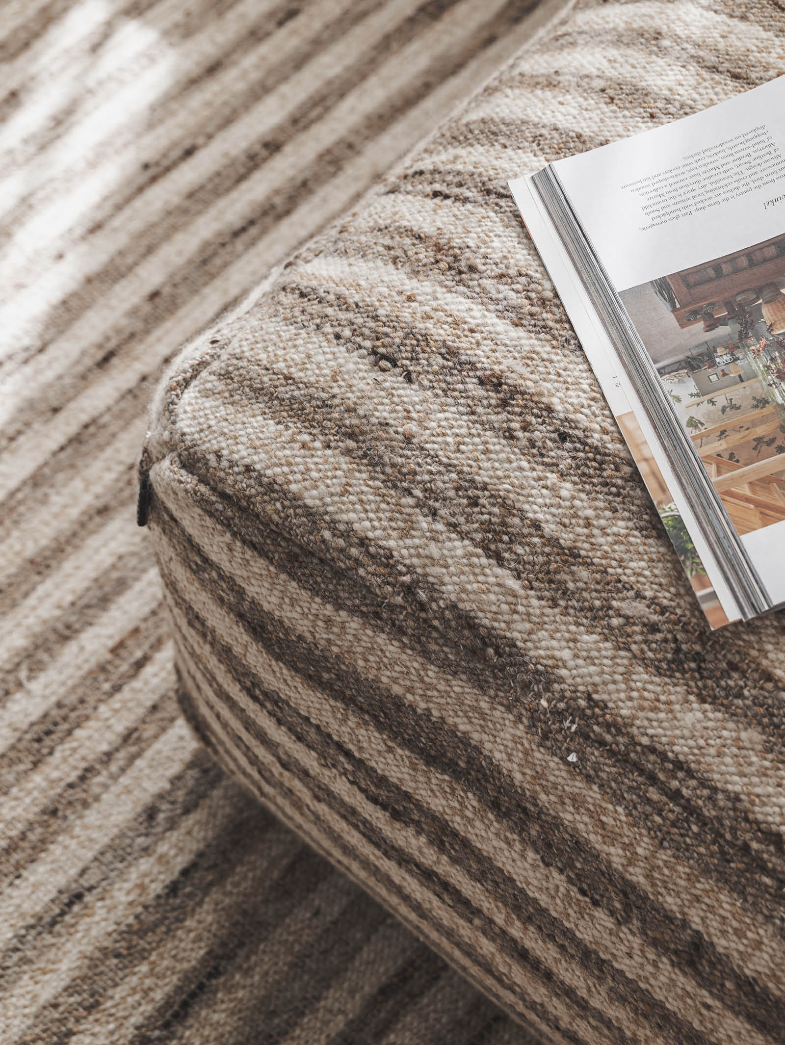 Embrace natural texture with the Paralla ottoman, which is upholstered with our Paralla rugs, a rich blend of wool and jute. Featuring timeless stripes in a palette of soothing nut colours, this cushy seat offers style, comfort and durability. It's filled with high-quality EPP beans, offering a supportive yet flexible seat that won't flatten over time. It's the perfect accent piece for extra seating or relaxed footrests.