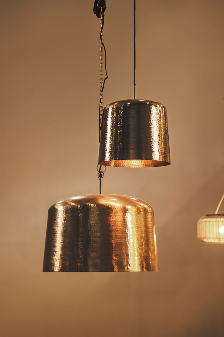 Made of hammered-steel, the Leguna pendant exudes understated elegance and industrial charm. Its surface reflects light beautifully, creating a warm glow that will lend ambience to any space. Merging craftsmanship with contemporary design, the Leguna makes for a striking focal point in dining areas, kitchen or hallways. Available in two sizes.