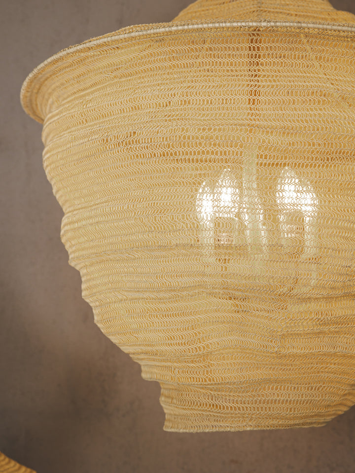 Visually captivating Vortex chandeliers will introduce a touch of industrial chic into a décor scheme. This statement pendant is made by hand and composed of intricate layers of iron mesh, forming an airy structure that diffuses light beautifully. The mesh has also been treated with a zinc powder coating to protect it against rust and chipping. Available in two sizes and two tones.