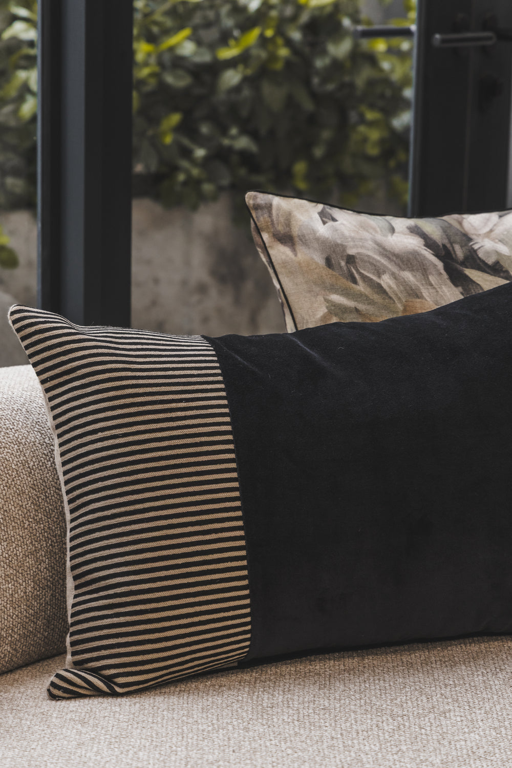 Handwoven scatter cushions in linen and cotton-velvet with contemporary, easy-to-style designs.