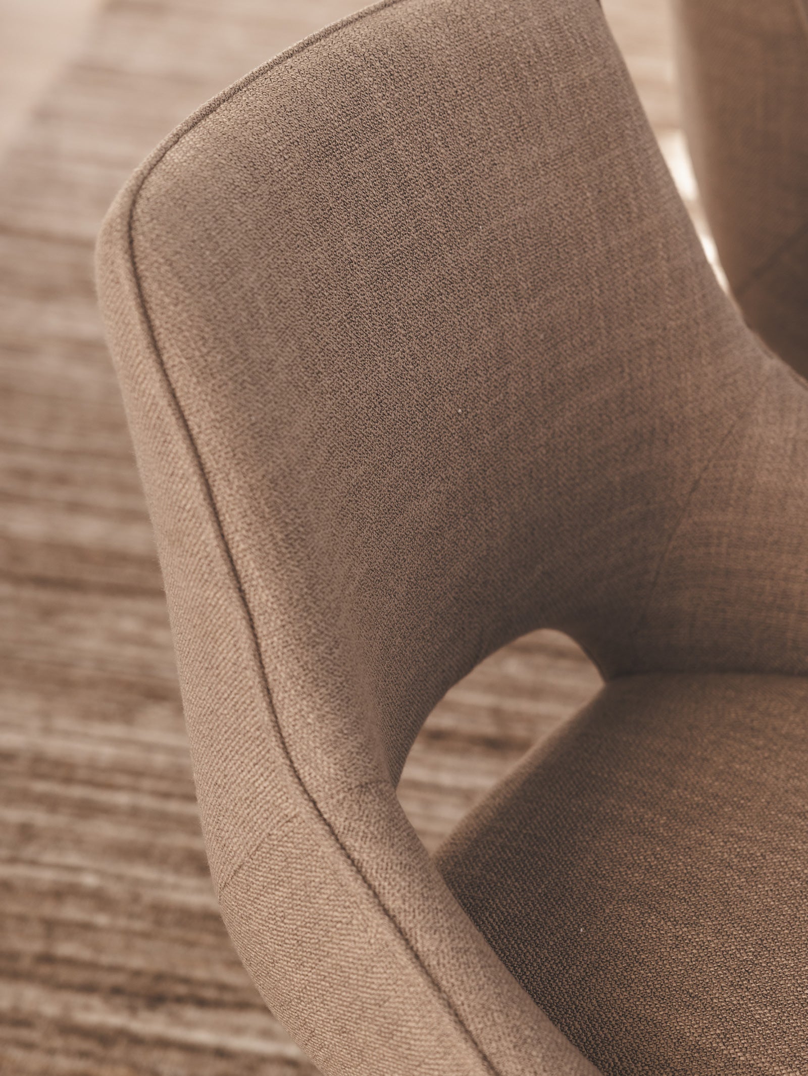 • Upholstered dining chair covered in Hertex Adriatic fabric (100% Polyester) with 360° swivel mechanism and tapered metal legs powder coated sand black.