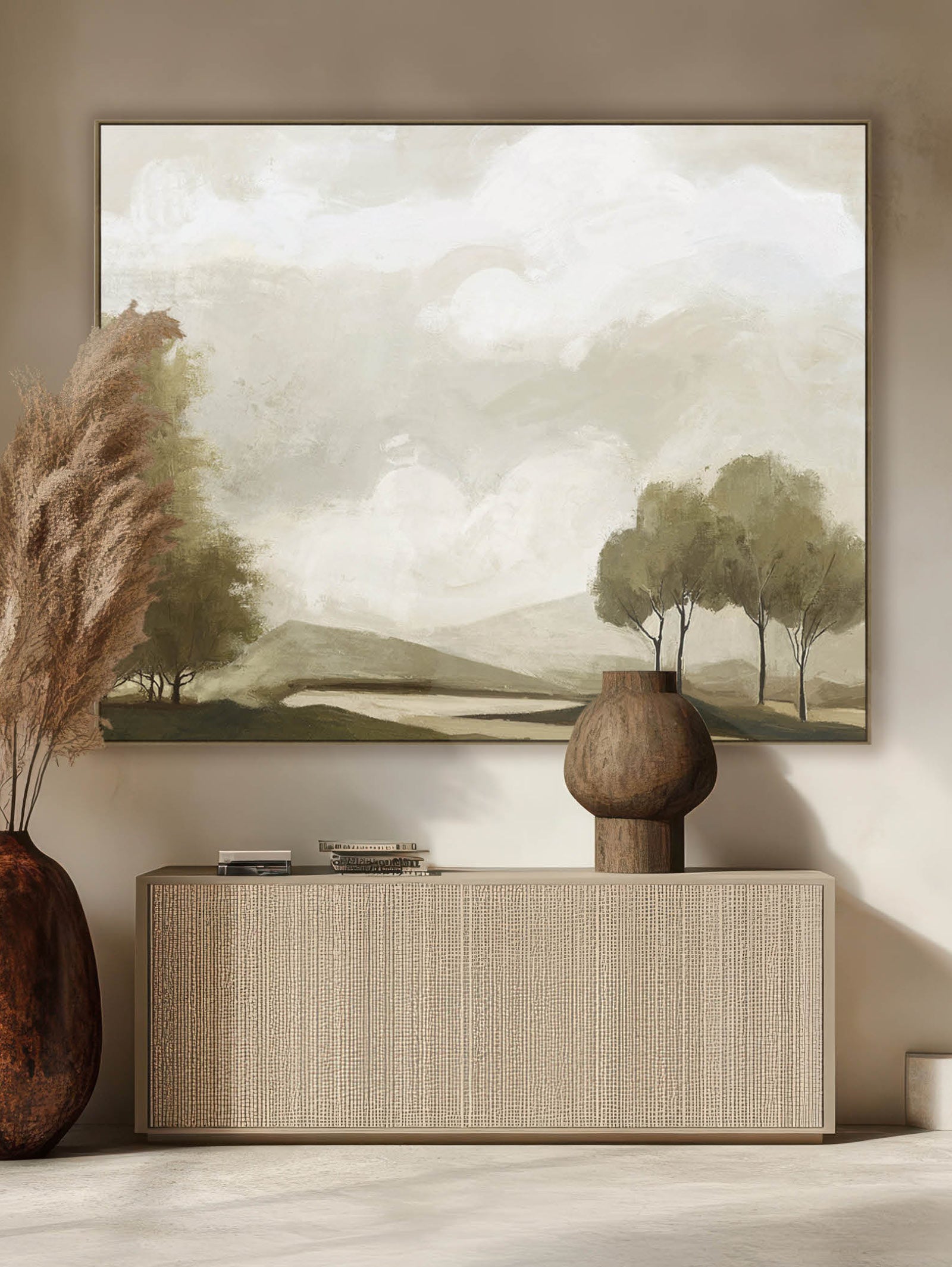 Bring the quiet poetry of nature into your home with the Stillwood Wall Art in Meadow. This extra-large framed canvas is a serene statement piece, designed to evoke the gentle stillness of a wooded landscape bathed in soft, natural light.