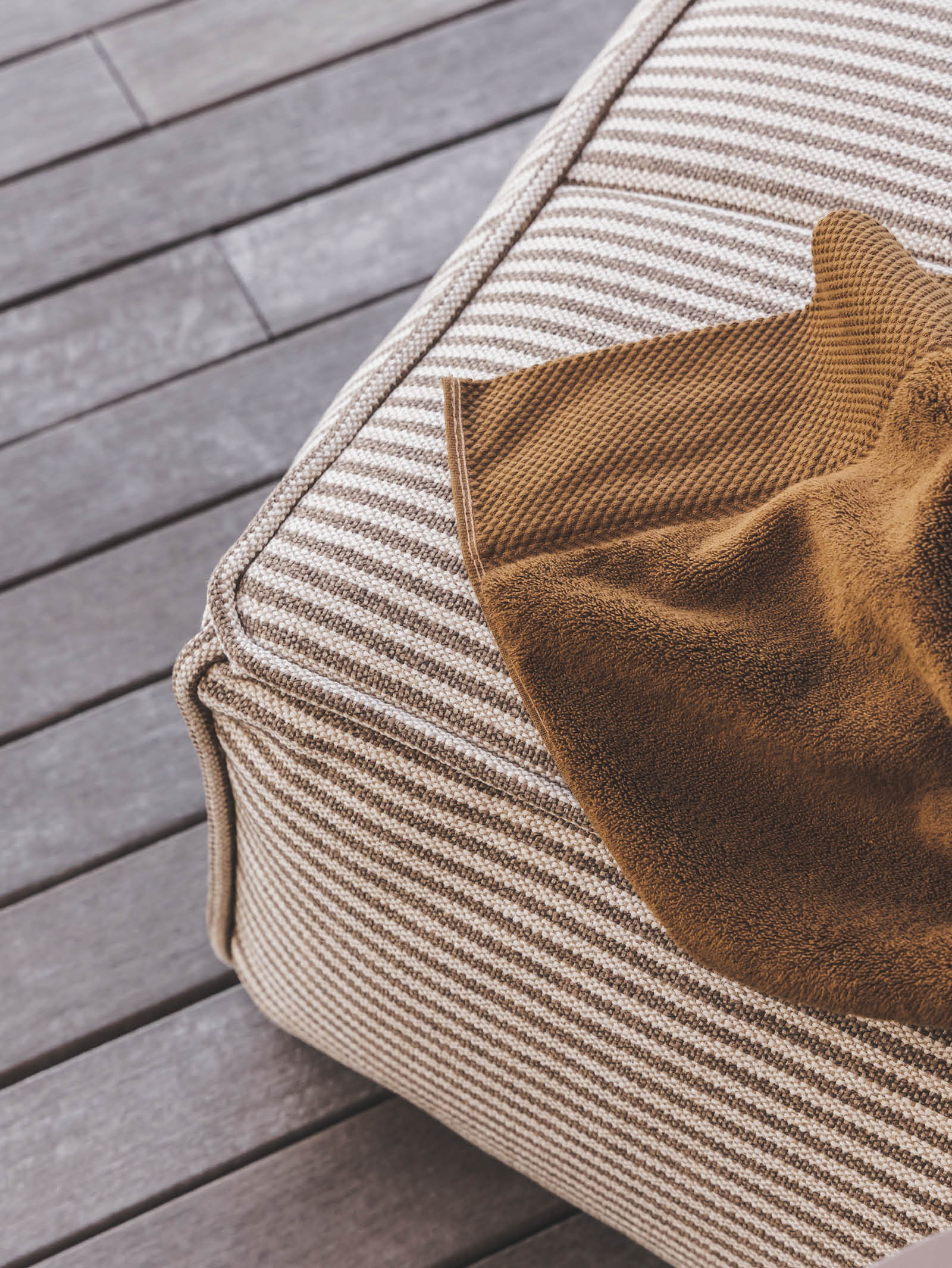 Fully outdoor lounger upholstered with Hertex's Henley fabric.