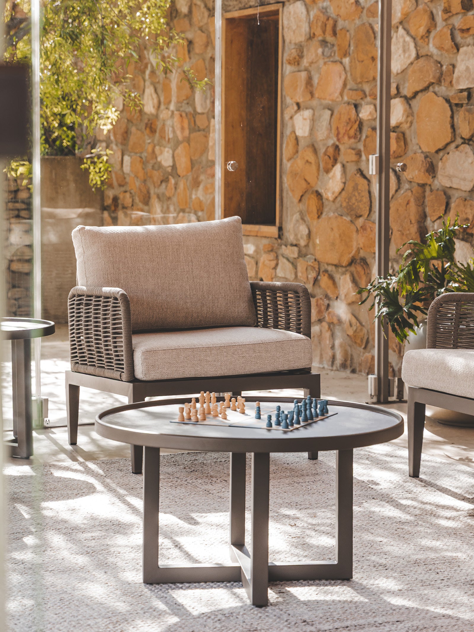Experience the ultimate outdoor escape with the Utopia sofa set, a stylish, long-lasting collection made for relaxed living. Built with robust aluminium frame, and seats and backrest woven with UV-resistant rope, this set combines timeless appeal with lasting durability. The easy-drain foam cushions, covered with outdoor-friendly olefin fabric, offer fast drying and enduring comfort. The set includes a three-seater sofa, two single seaters and two side tables with sintered tabletops.