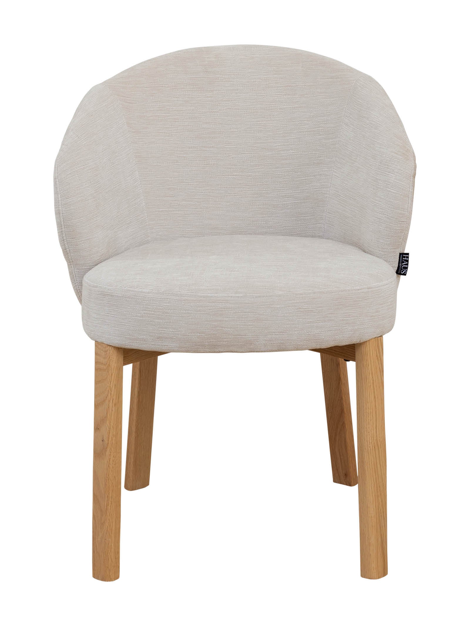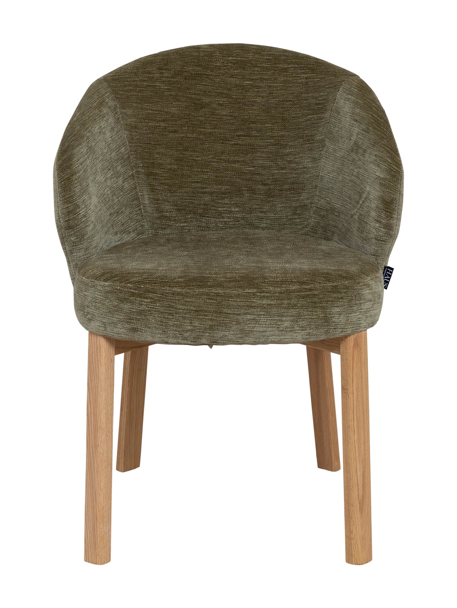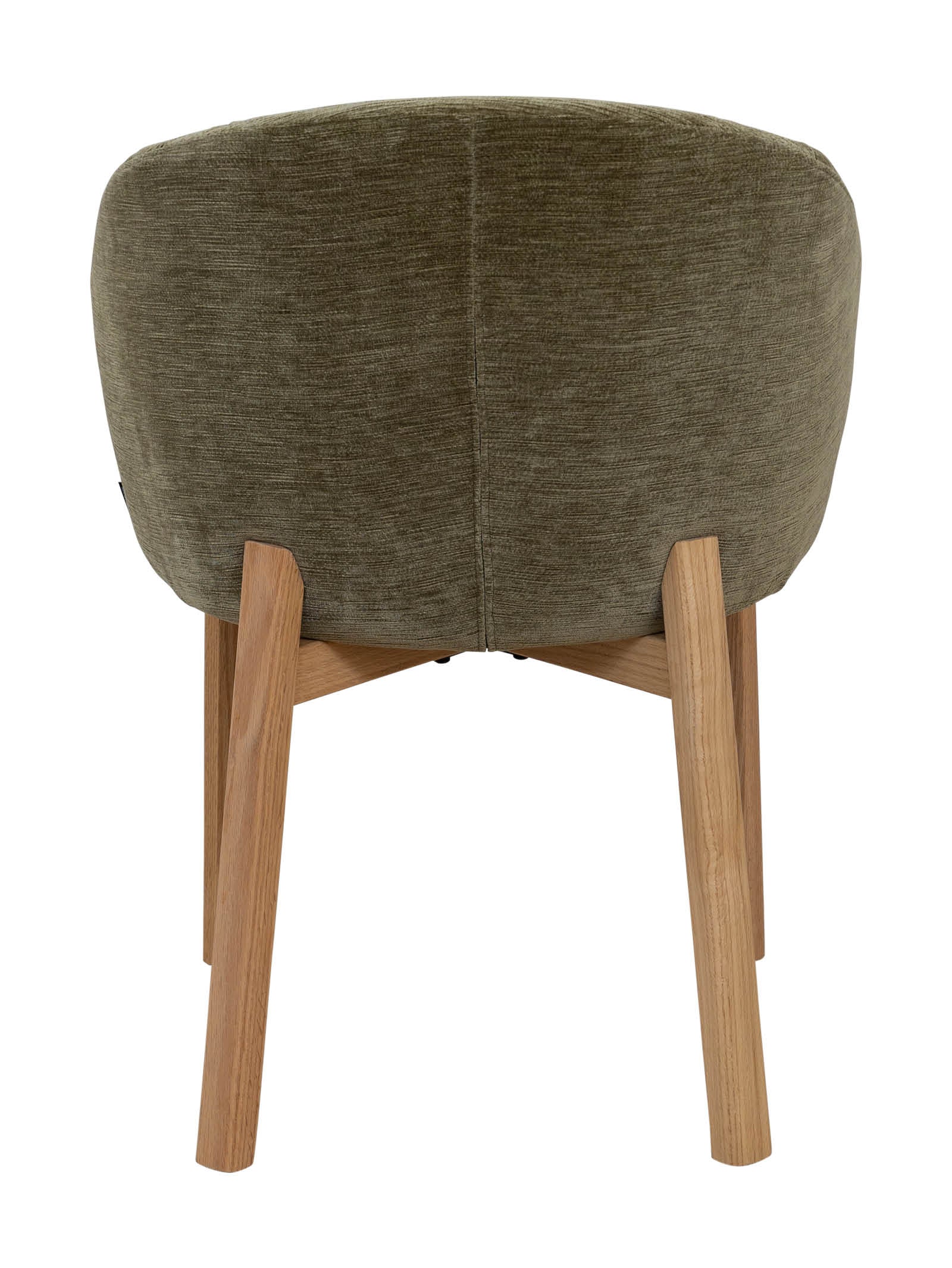 Made of solid oak for strength and natural beauty, the Dahlia dining chair's other standout feature is an artfully curved backrest, designed for ergonomic support and a graceful silhouette. Upholstered with Hertex Wildwood fabric, it offers a plush, comfortable place to linger over meals.