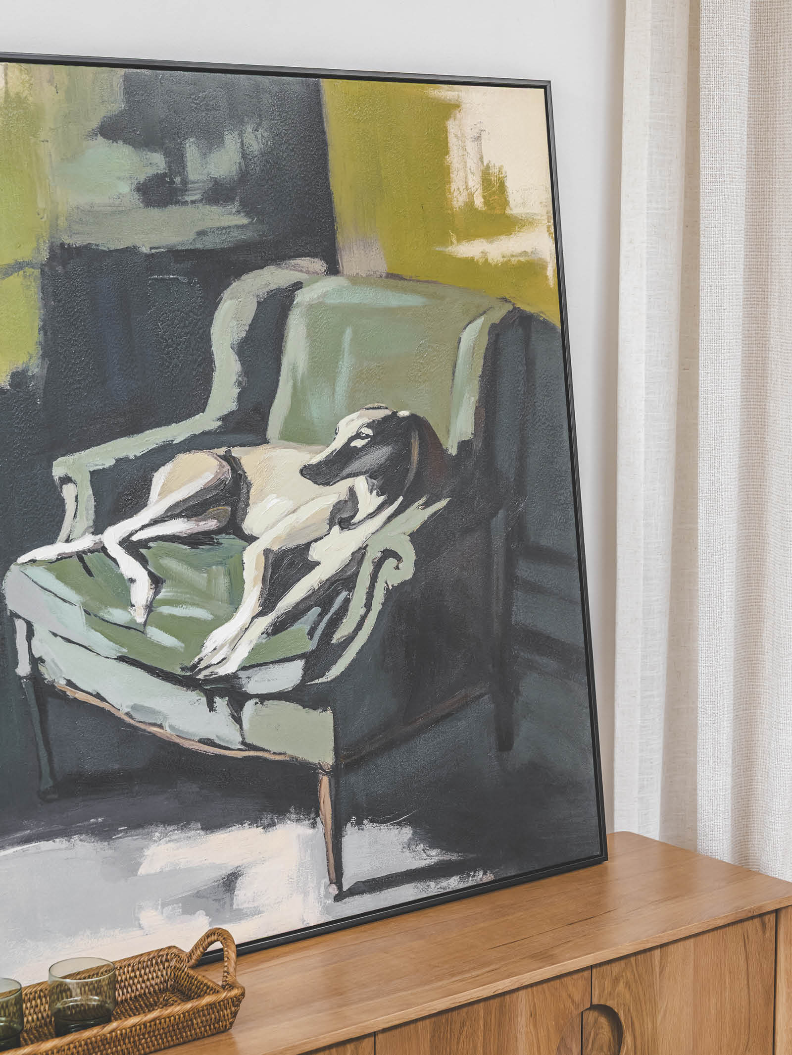 The Loyal Companion art is dominated by rich shades of green and black, accented by a hand-painted finish with visible brushstrokes that give the piece depth. The extra-length format transforms the portrait into an immersive presence.