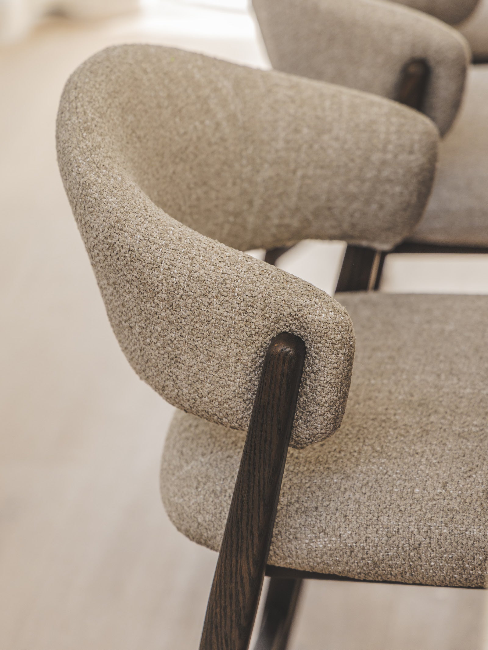 Bring modern sophistication and lasting comfort to a space with Lorenzo seating. Comprising a dining chair, occasional chair and a counter chair, each piece in this range features a solid oak construction that showcases the natural beauty of the wood grain and ensures durability. Curved backrests gently wrap around your body, offering supportive comfort. Both the seat and backrest are padded and upholstered with soft polyester. Available in two tones.