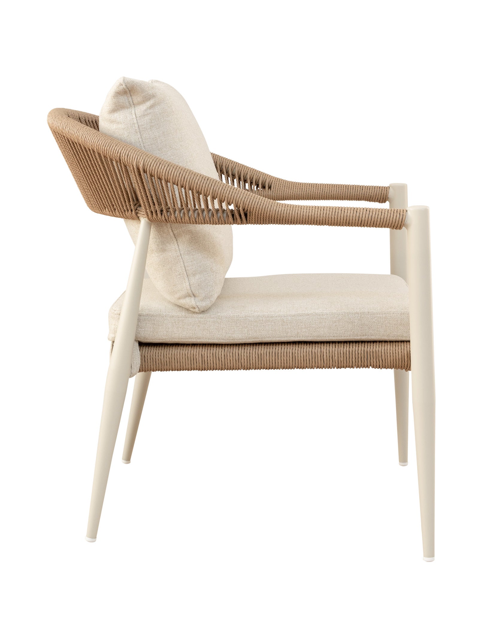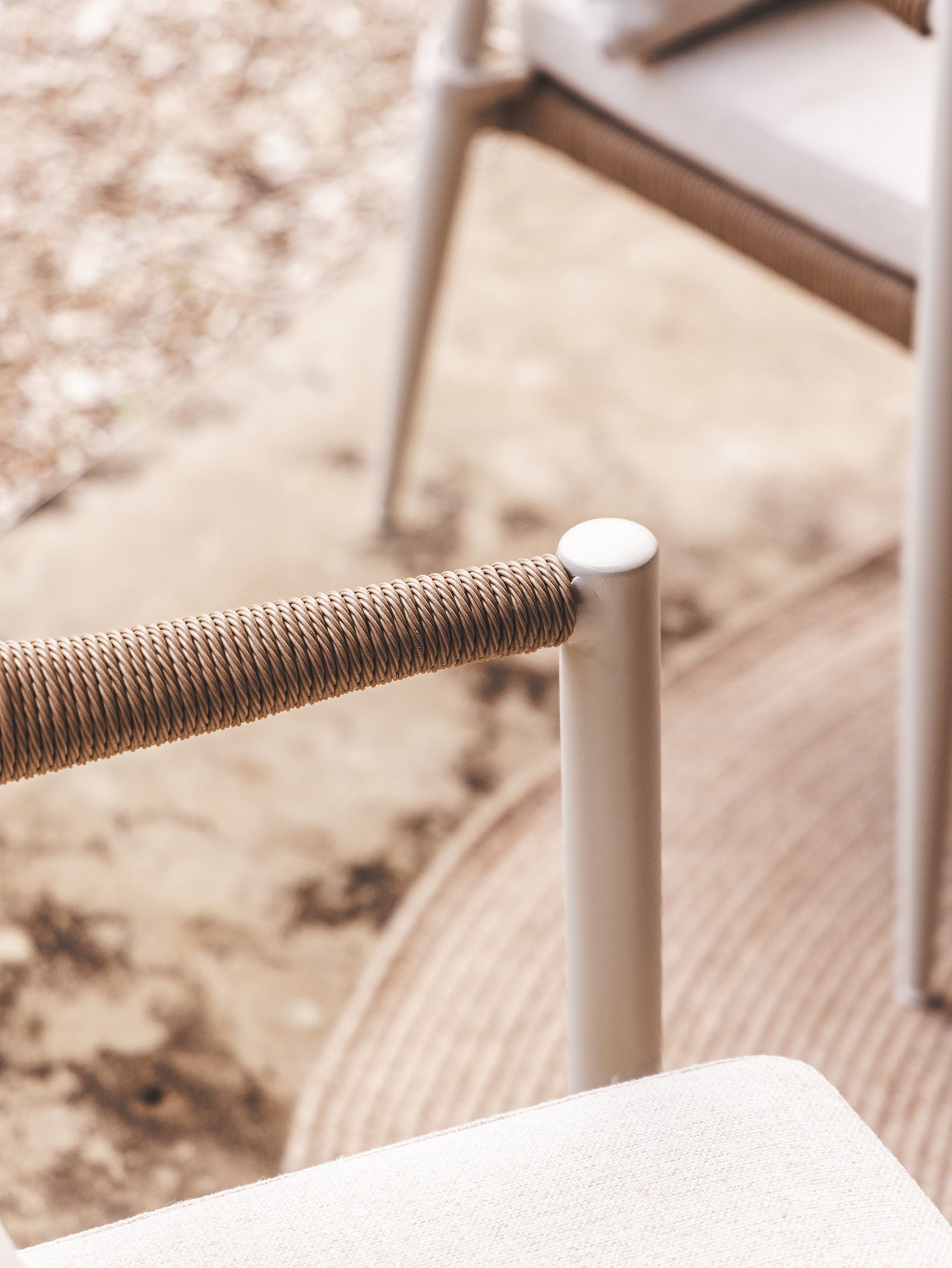 Fully outdoor aluminium sofa set featuring two coffee tables, two single-seaters and a three-seater.