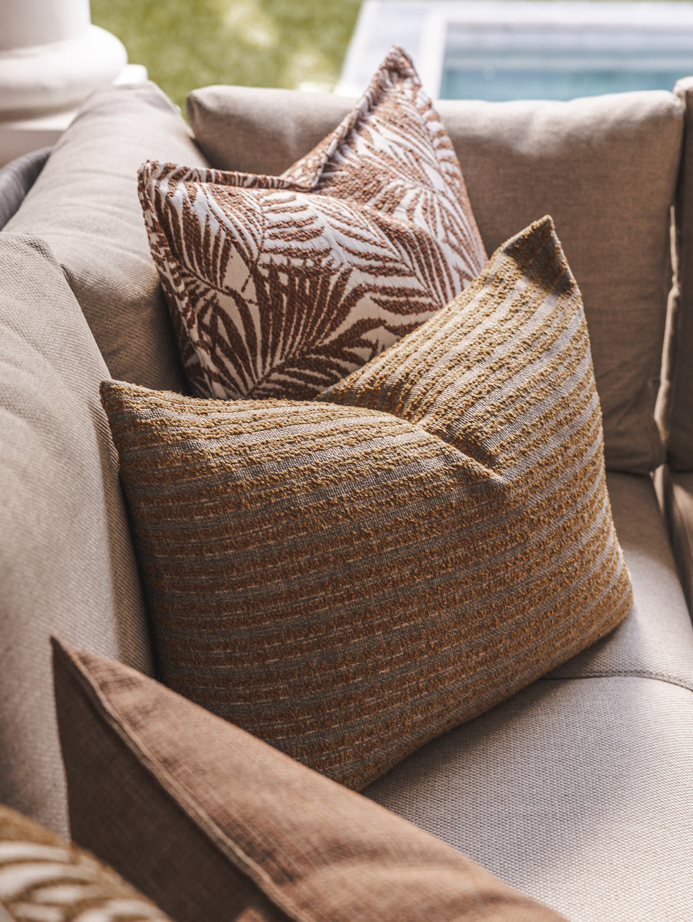 Bring a laid-back look and feel to undercover outdoor areas with the Fiji collection of scatter cushions, a South African-made range that will inspire relaxation. It features a breezy-looking palm leaf pattern, a versatile stripe and a beautifully textured plain, all of which come in understated, easy-to-incorporate colourways and correlate to perfection with one another. Not only are the polypropylene-polyester covers ready for the elements, but their flameretardant and stain-resistant properties give them added longevity. Each cushion features a YKK plain zip, while some are finished with an Oxford flap. Duck feather-duck down inner included.