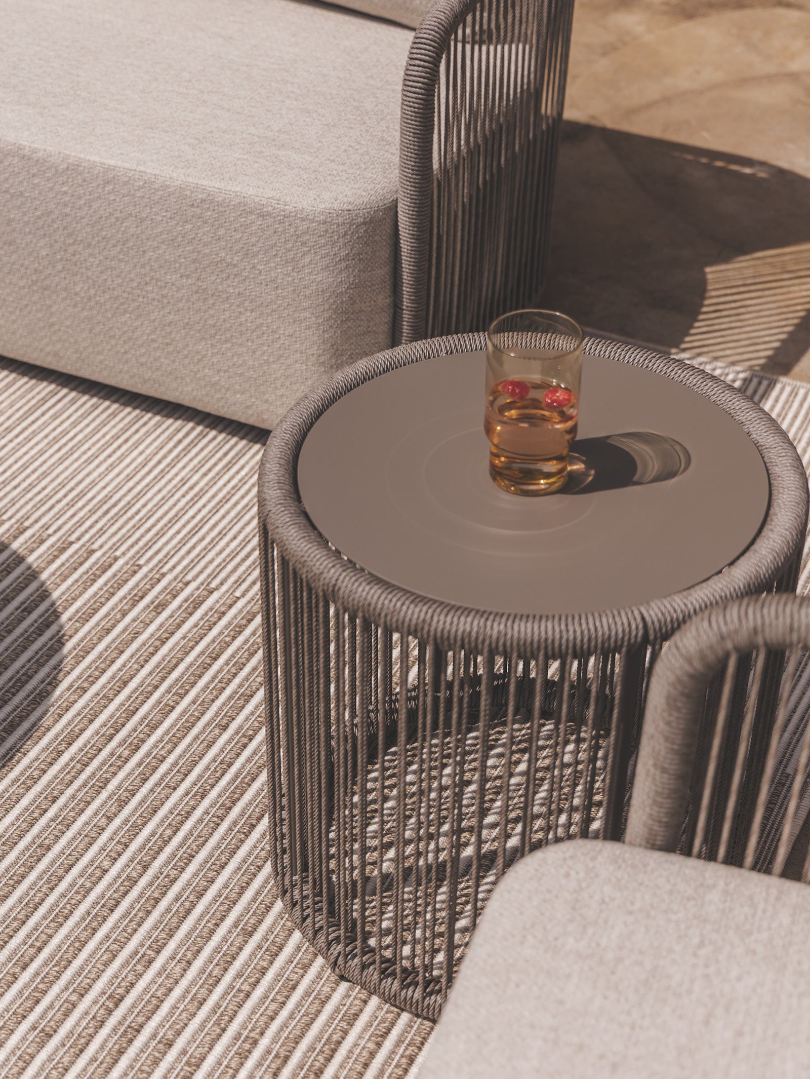 Bacalar coffee and side tables expertly combine contemporary design with natural textures. Durable aluminium provides a sleek tabletop, while elegant PET wicker rope detailing forms the body of the tables, adding a warm, artisanal touch. Lightweight yet sturdy, these fully outdoor accents are ideal for open-air entertaining or everyday use.
