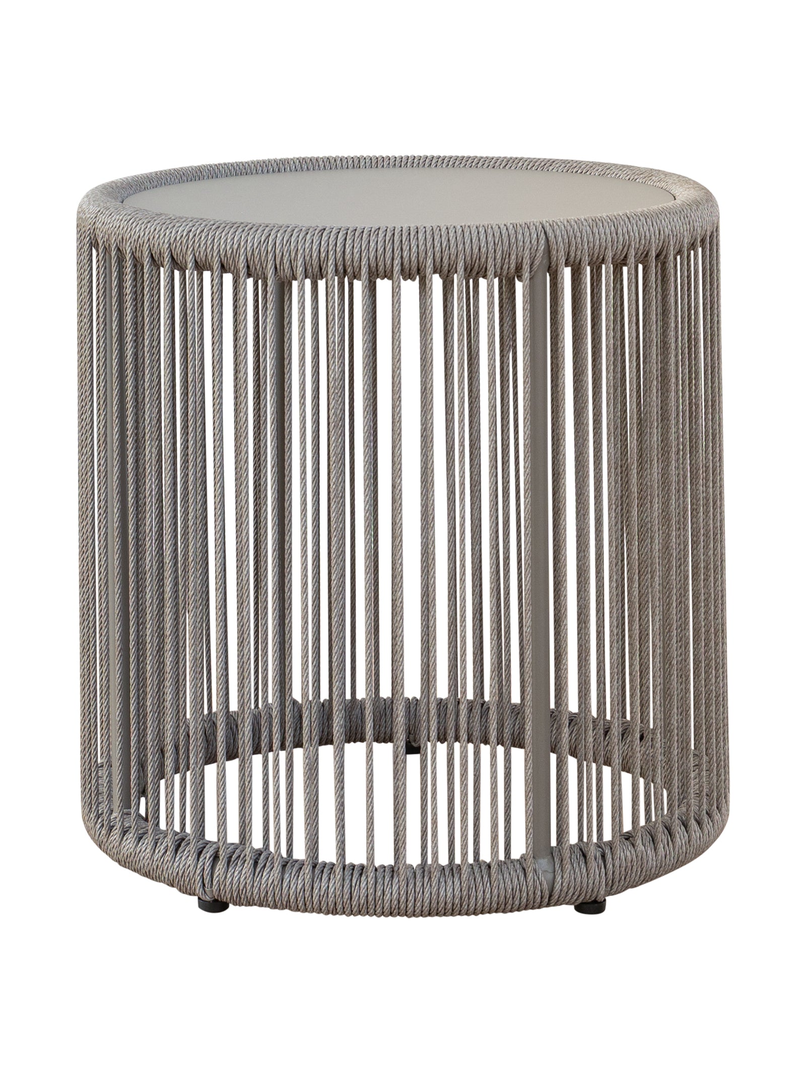 Fully outdoor coffee and side tables with aluminium tabletop and PET wicker rope detailing.