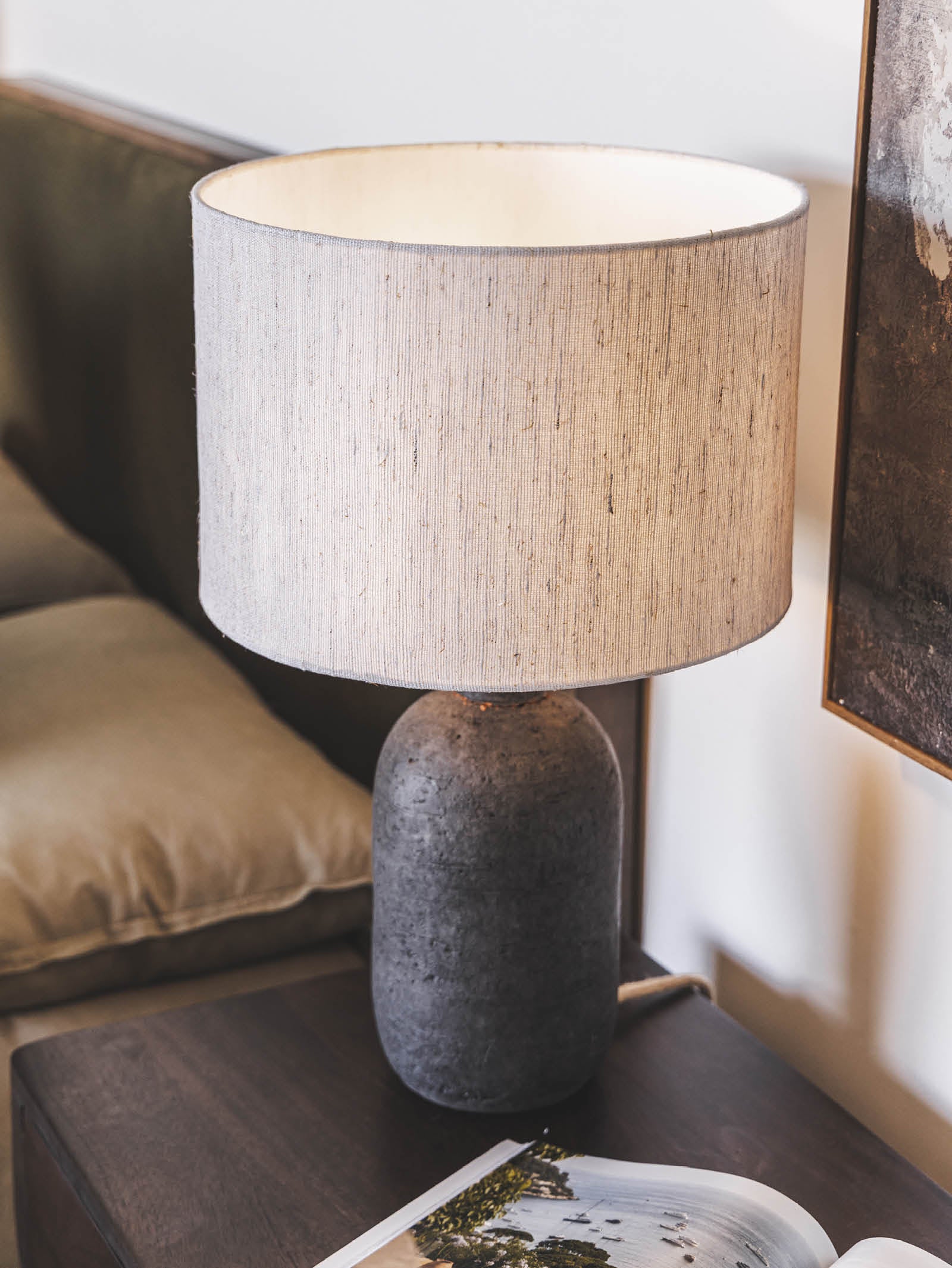The Dark Horse table lamp is a beautifully balanced piece with a terracotta base that will infuse a space with organic warmth. A soft, neutral fabric shade provides a gentle, diffused glow, while a built-in dimmer switch allows you to easily adjust the light. It's a great addition to living room side tables, bedroom nightstands or an office space. Available in two sizes.