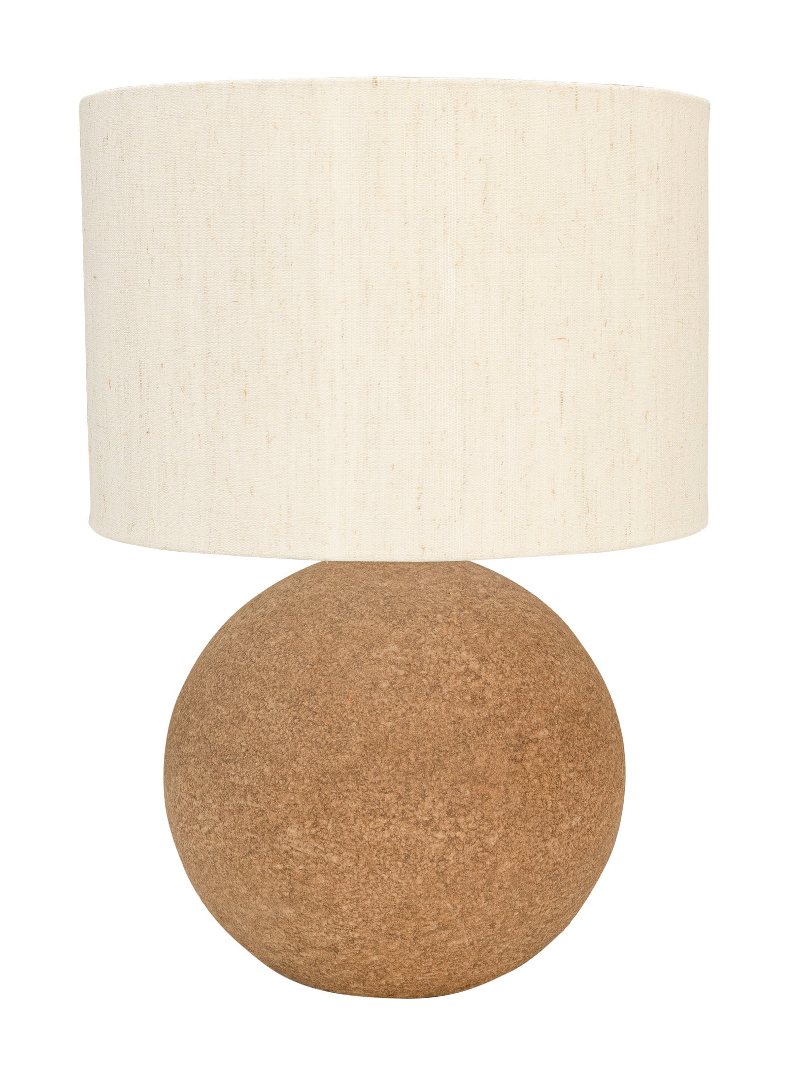 Table lamp with fabric shade and spherical base made of recycled materials.