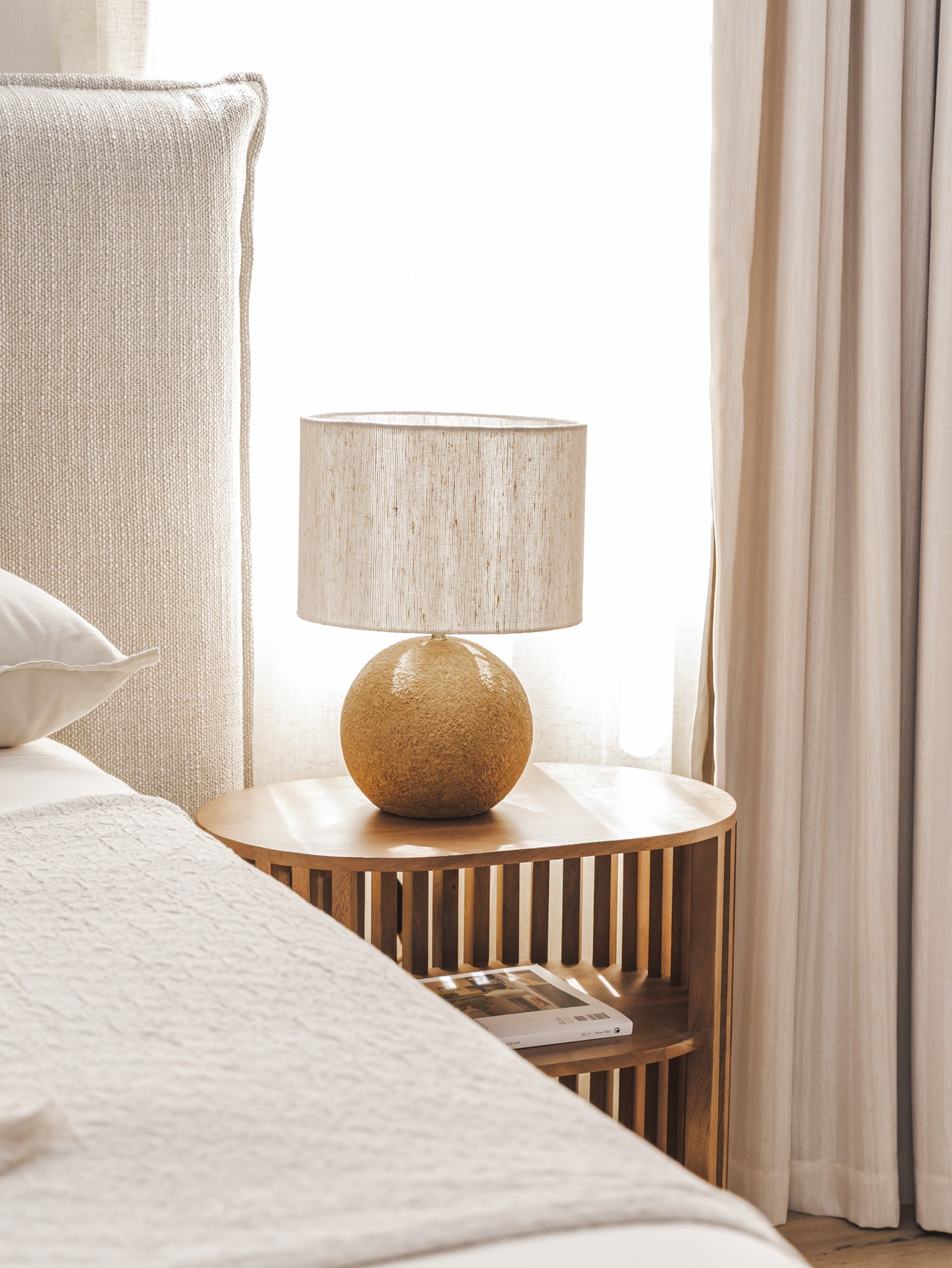 Enhance the atmosphere of a room with the Reimagined table lamp. A chic spherical base created from recycled material makes for a look that is both timeless and thoughtfully made, while a gently diffusing fabric shade casts warm, inviting light. With a simple touch of the dimmer switch, you can seamlessly transition a space from bright to cosy. Available in two sizes.