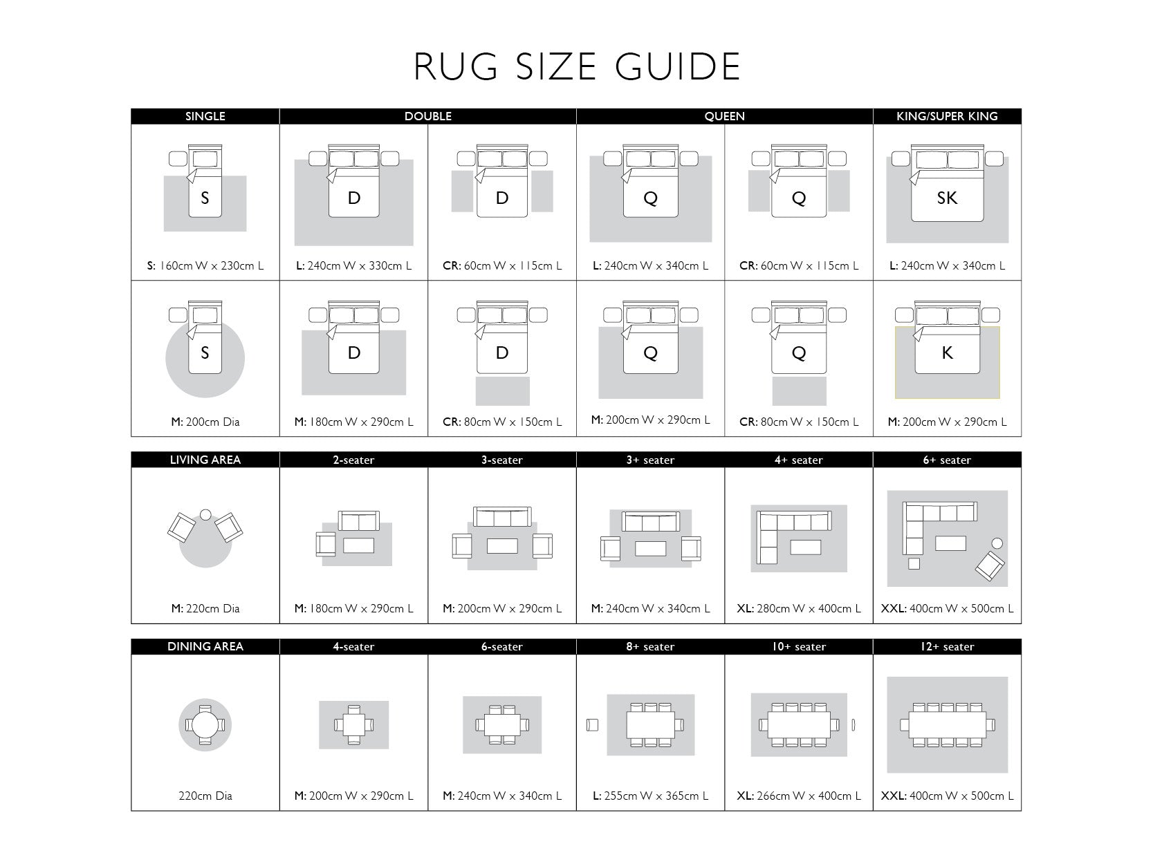 L: Large rugs: 240 x 330cm; 240 x 340cm; 255 x 365cm; 240cm dia; 250cm dia