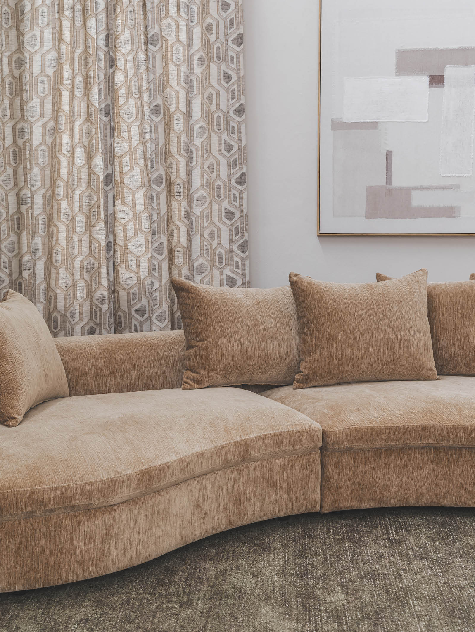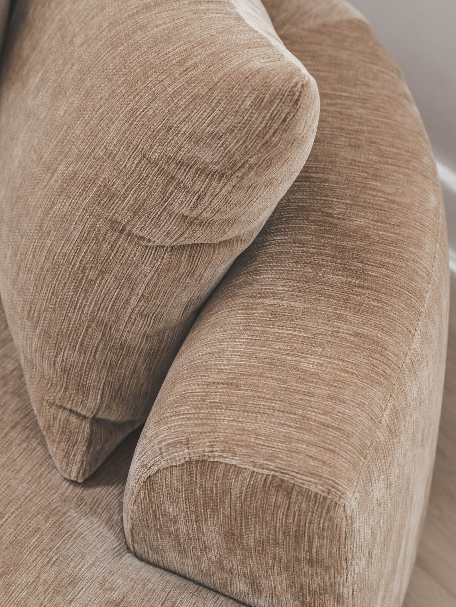Large, curved sofa upholstered with Hertex's Wildwood fabric.